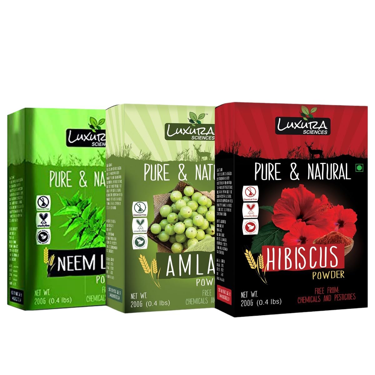 Luxura Sciences Natural Hair Care Set (200g x 3) - Neem Amla & Hibiscus Powders for Healthy Nourished Hair. A perfect regular hair care solution for all hair types.