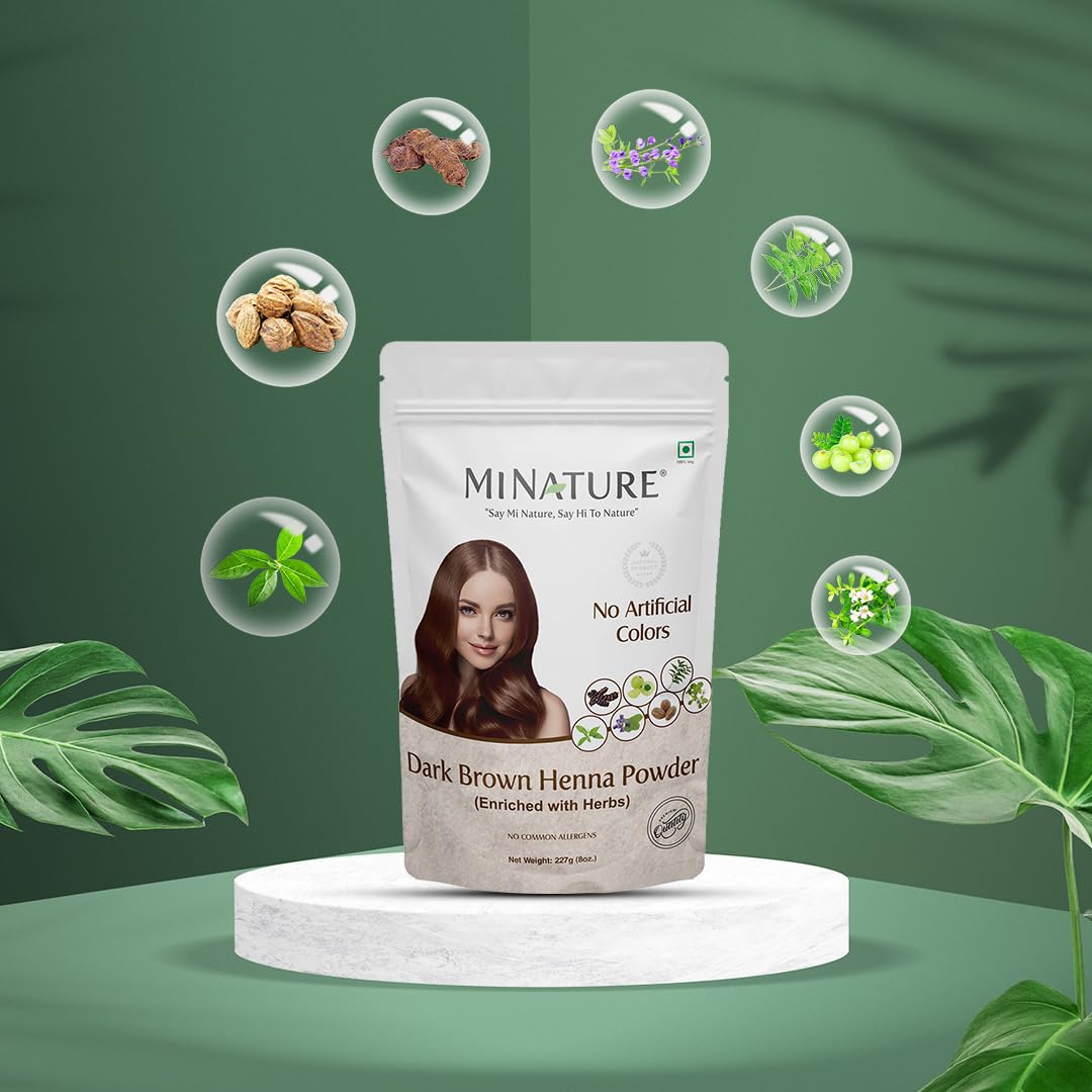 This henna powder is specifically formulated to give your hair a rich and natural dark brown color. This product combines henna and indigo powder to achieve the desired dark brown shade. Indigo is another natural dye that complements henna. HOW TO USE: Step 1:- Mix Minature Dark Brown Henna Powder with warm water to the powder and mix it into a thick smooth paste. The consistency should be like yogurt. You can also add a few drops of lemon juice to enhance the color. artificial preservatives ensuring a more natural. Step 2: Wear disposable gloves to protect your hands from staining. Apply a layer of petroleum jelly or a protective cream around your hairline and ears to prevent skin staining. Section your hair and start applying the henna paste from the roots to the tips ensuring complete coverage. Step 3: Allow the henna to sit on your hair for 2-4 hours depending on the intensity of color desired. The longer you leave it the deeper the burgundy color. After the desired time has passed rinse your hair thoroughly with warm water. Avoid using shampoo for at least 24 hours to allow the color to set. Apply a natural conditioner or hair mask to lock in moisture and enhance the shine of your Dark Brown hair