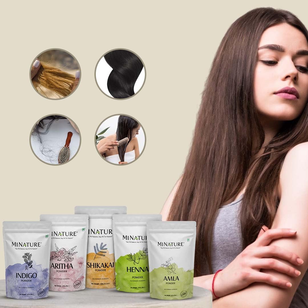 Introducing our Minature Pack of 5 a hair care revelation featuring Organic Henna Shikakai Amla Aritha and Indigo Powder. Unlock the secret to stunning Shine as regular use infuses your hair with a natural luster elevating its appearance to a radiant new levelWitness the magic of maintaining your hair's natural pH balance as these natural powders elevate your hair care routine with a nurturing and holistic approach. Embrace an environmentally thoughtfully crafted with pure natural and chemical-free ingredients caring for both your hair and the planet. Our Unisex pack caters effortlessly to both men and women designed to suit all hair types and preferences making it an inclusive and versatile hair care solution. Experience the ultimate hair care experience combining the finest Organic Henna Shikakai Amla Aritha and Indigo Powder for unparalleled hair perfection.
