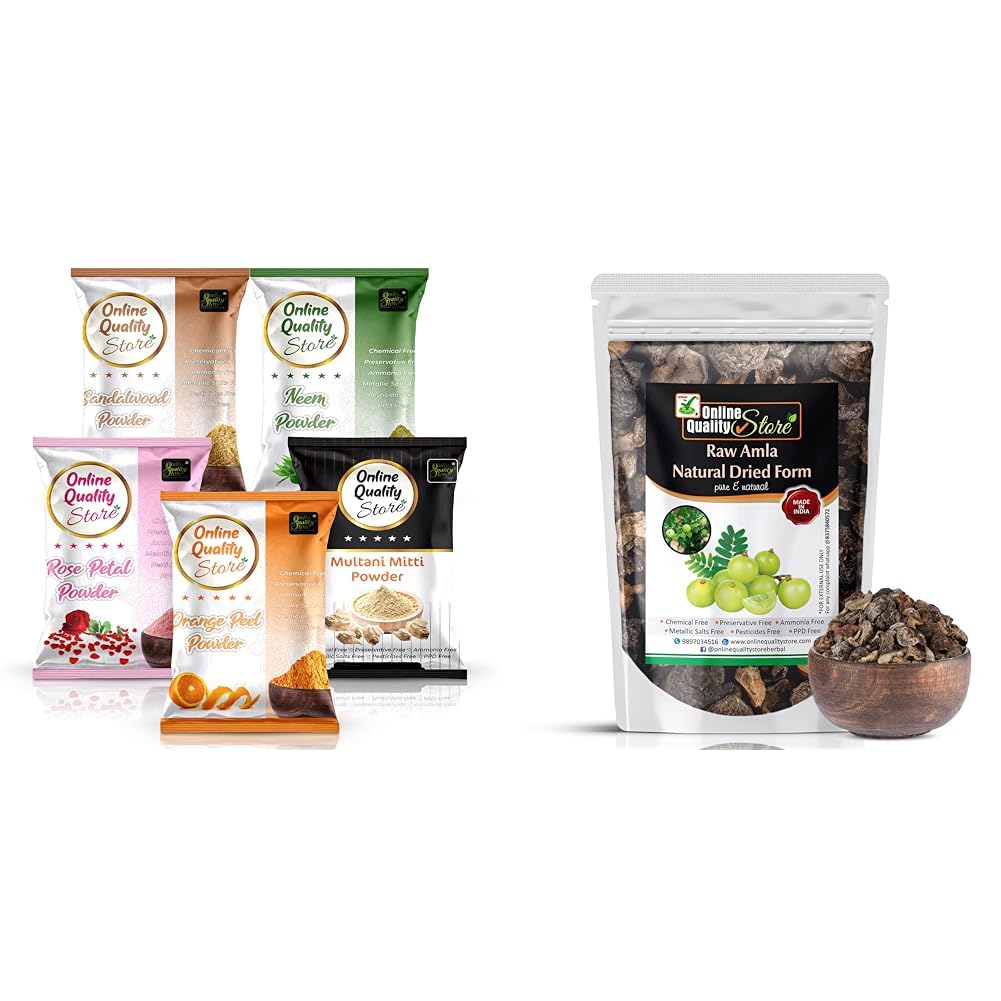 Online Quality Store Multani Mitti + Chandan Powder + Orange Peel Powder + Neem Powder + Rose Powder (Pack of 5) 400g & Raw Amla For Hair Natural (Amla) Dried Form 900g