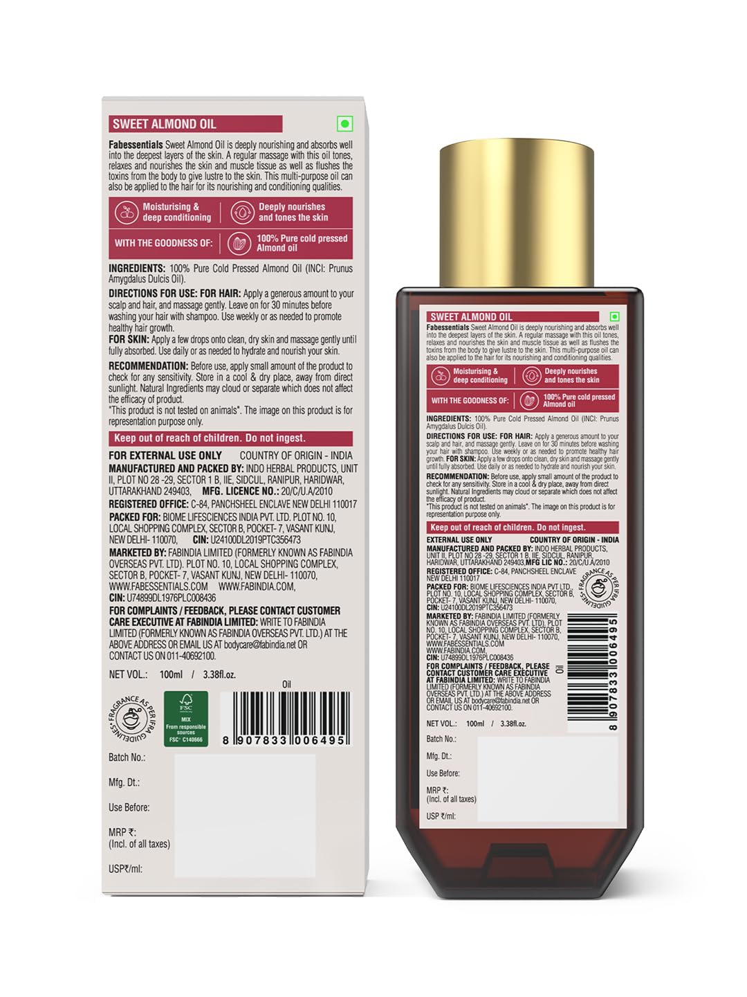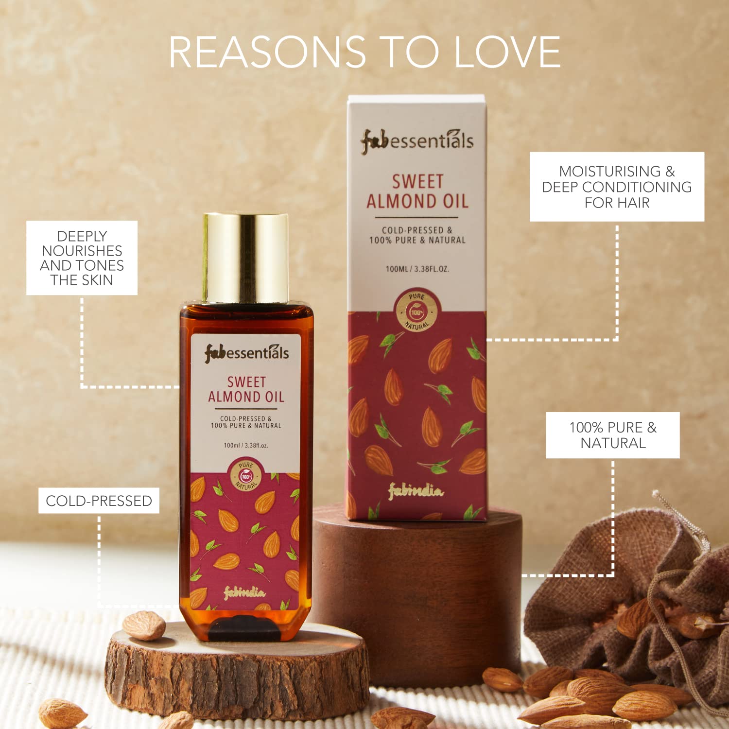 Fabessentials Sweet Almond Oil | Cold-Pressed & 100% Pure & Natural | Multipurpose oil for Body & Hair | Nourishes skin | Deep Conditioning for Hair - 100 ml