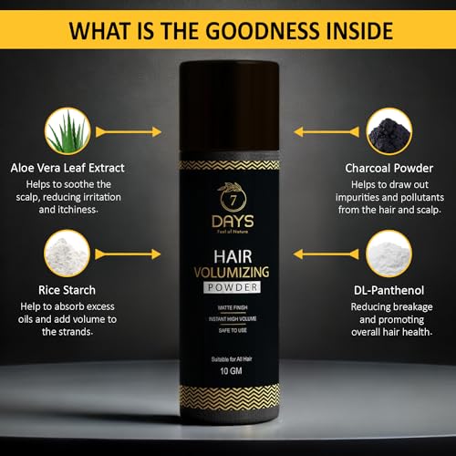 • 7 Days Hair Volumizing Powder is 100% Natural & Safe to use. It contains natural ingredients such as Aloe Vera leaf Charcoal Powder and DL-Panthenol.