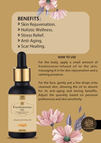 Al Masnoon Frankincense Oil Infused with Olive Oil offers a natural healing and rejuvenating solution for both skin and hair. The powerful combination of frankincense essential oil and olive oil provides deep nourishment hydration and protection against environmental damage. This versatile oil blend promotes healthy radiant skin and strong shiny hair. Free from harsh chemicals this 30ml bottle is perfect for daily use and easy to incorporate into your beauty routine. Embrace the natural benefits of Al Masnoon Frankincense Oil Infused with Olive Oil and achieve a healthier more youthful appearance.
