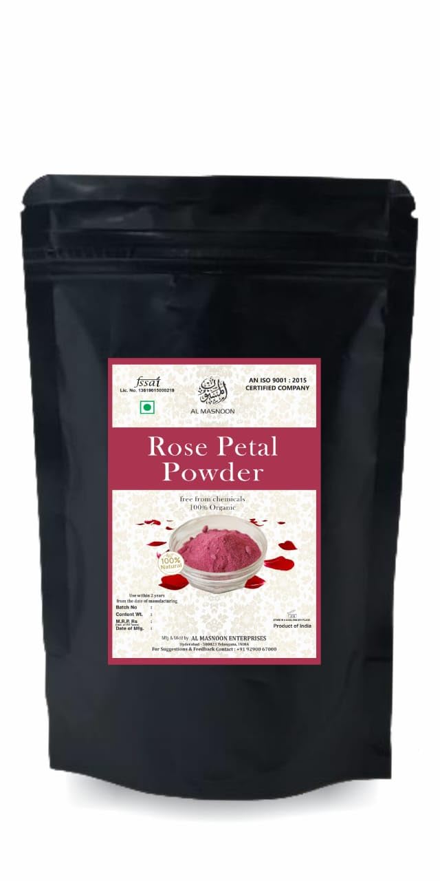 Indulge in the natural beauty and benefits of Al Masnoon Rose Petal Powder. This 100g pack contains 100% natural dried rose petal powder perfect for skincare haircare and culinary uses. Experience the aromatic and nutrient-rich properties of roses in a convenient powder form.Embrace the natural goodness of Al Masnoon Rose Petal Powder a versatile and luxurious addition to your beauty and culinary routines. Enjoy the soothing nourishing and aromatic benefits of this premium rose petal powder.