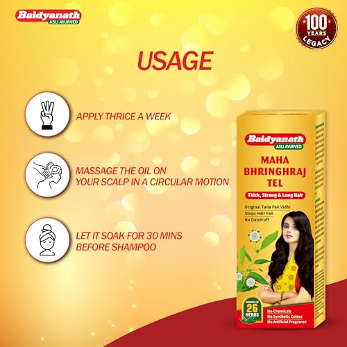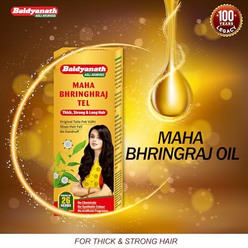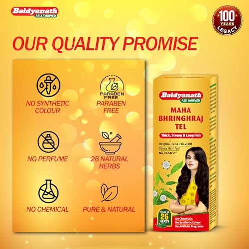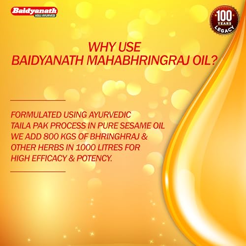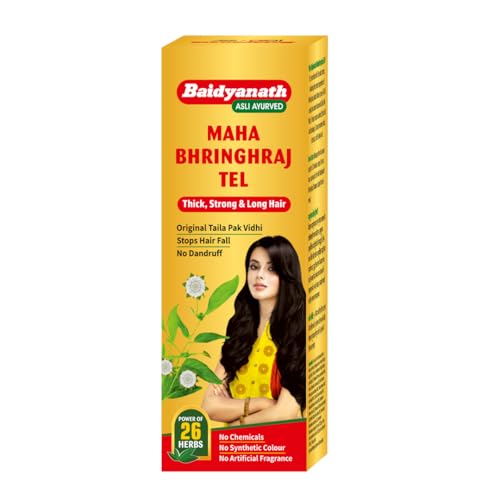 Say hello to thick strong & shiny hair with Baidyanath Mahabhringhraj Tel - the ultimate solution to a moisturizing hair treatment. Popularly known as Keshraj (king of hair) this powerful hair oil is packed with vitamins proteins antioxidants and nutrients like magnesium iron and Vitamin D. This time-tested classical Ayurvedic oil is prepared using the ancient Taila Pak process with a combination of 26 exotic herbs in pure Til Tel (sesame oil). This process helps extract the medicinal properties of all the herbs thus making the oil highly potent. Bhringhraj Kwath is one of the major ingredients that help strengthen your hair roots & keeps the hair healthy. Baidyanath Mahabhringhraj Tel helps reduce hairfall & fights dandruff. Immerse yourself in the natural essence of this oil to enhance your overall hair health & give it a youthful glow.