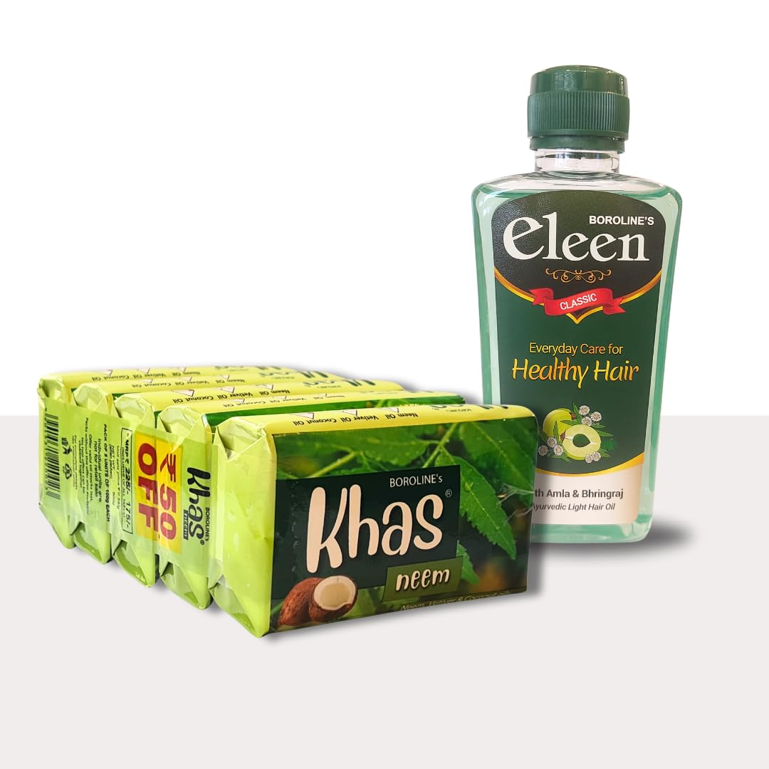 BOROLINE Khas Neem Soap (Pack of 5) & Eleen Classic Herbal Light Hair Oil 200 ml X 1 (Combo Pack of 6)