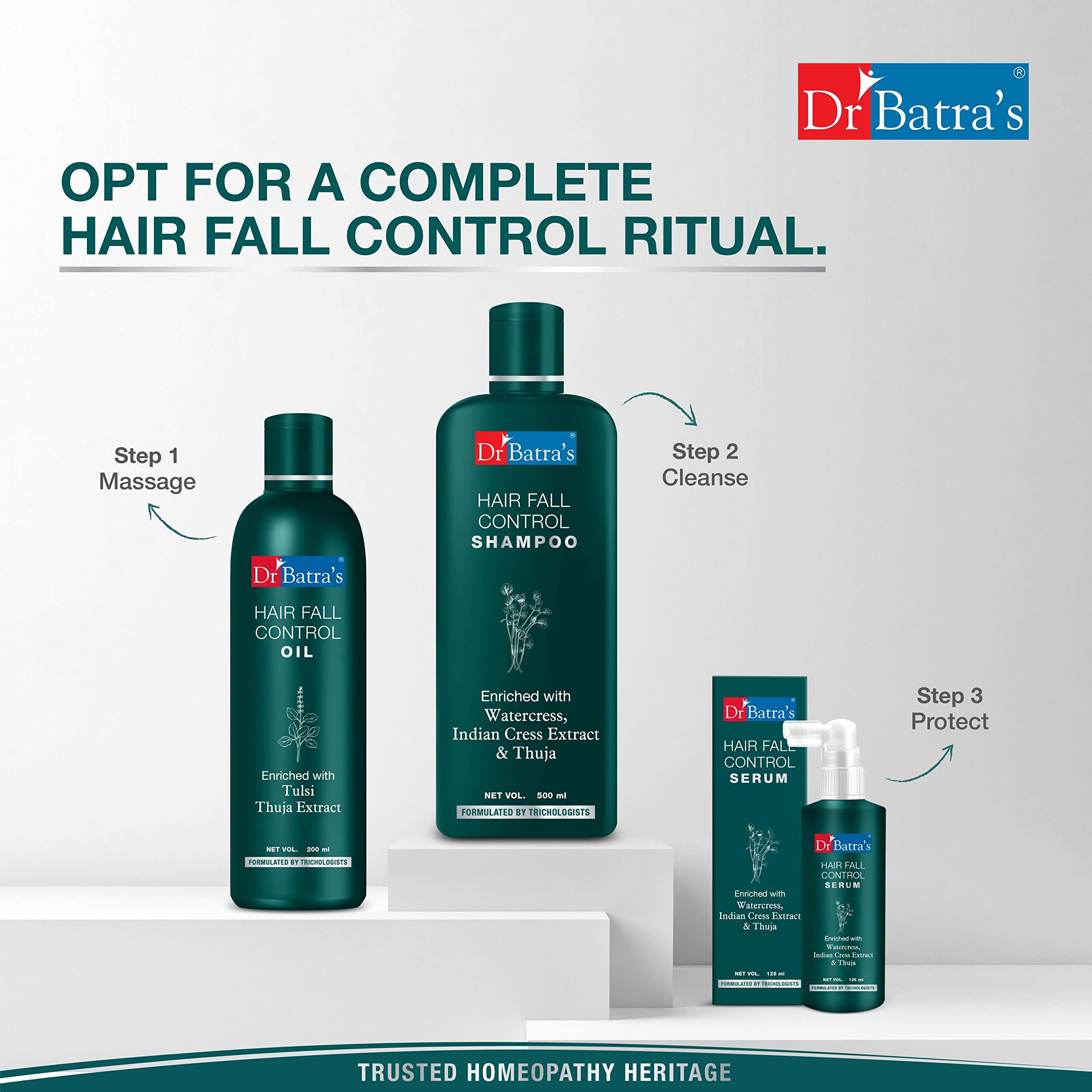 Dr Batra's Hair Fall Control Oil is a gently formulated hair oil specially designed to take care of the needs of a sensitive scalp and hair that are prone to breakage. Tulsi thuja and Brahmi enriched hair fall control oil gives you the hair you've always dreamt of. It is 100% safe and does not consist of any harmful ingredients. It nourishes and strengthens hair roots and gives your hair an everlasting shine. Key Ingredients: Thuja: âThuja is a powerful antioxidant that in the hair caused by an unhealthy scalp. âIt helps soothe an inflamed scalp âSoothes and treats chemically treated hair Tulsi: âStimulates and enhances circulation in the scalp to ensure healthy hair follicles. âTulsi provides your hair with much-needed nourishment. âTulsi's anti-properties keep the scalp healthy and hair . Brahmi âBrahmi consists of Zinc an essential mineral that contributes to hair re-growth. âStrengthens hair follicles and increases hair thickness. âBrahmi helps soothe an irritated scalp. Why should you choose Dr Batra's Hair Fall Control Oil? â100% Natural ingredients âSafe to use âDeveloped by ologists âSuitable for all hair types âWorks best on a sensitive scalp Directions: Step 1: Squeeze a small amount into your palm. Step 2: Apply evenly to the scalp. Step 3: Using your fingertips massage the scalp.