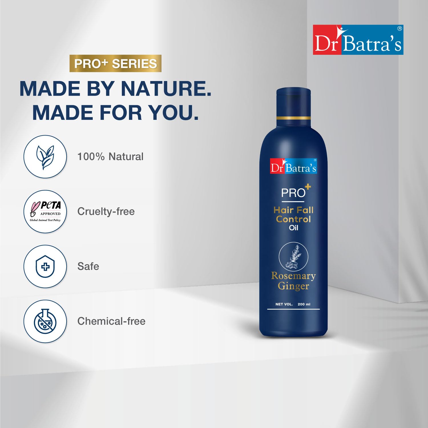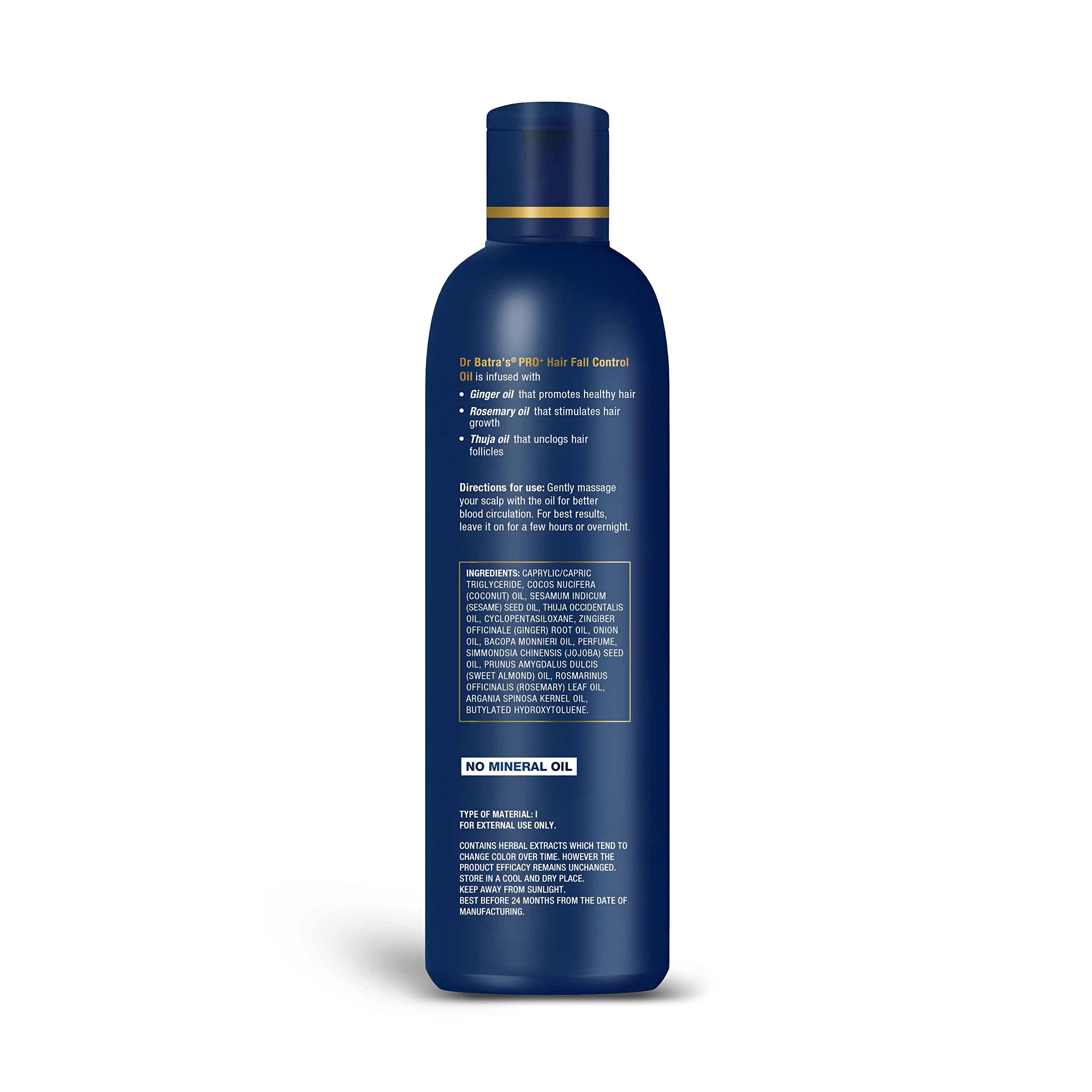 • "Dr Batra's PRO+ Hair Fall Control Oil deeply nourishes and strengthens hair from the root. It is enriched with a goodness of Ginger and Rosemary Extracts. oGinger helps promote healthy hair oRosemary helps to stimulate new hair growth "