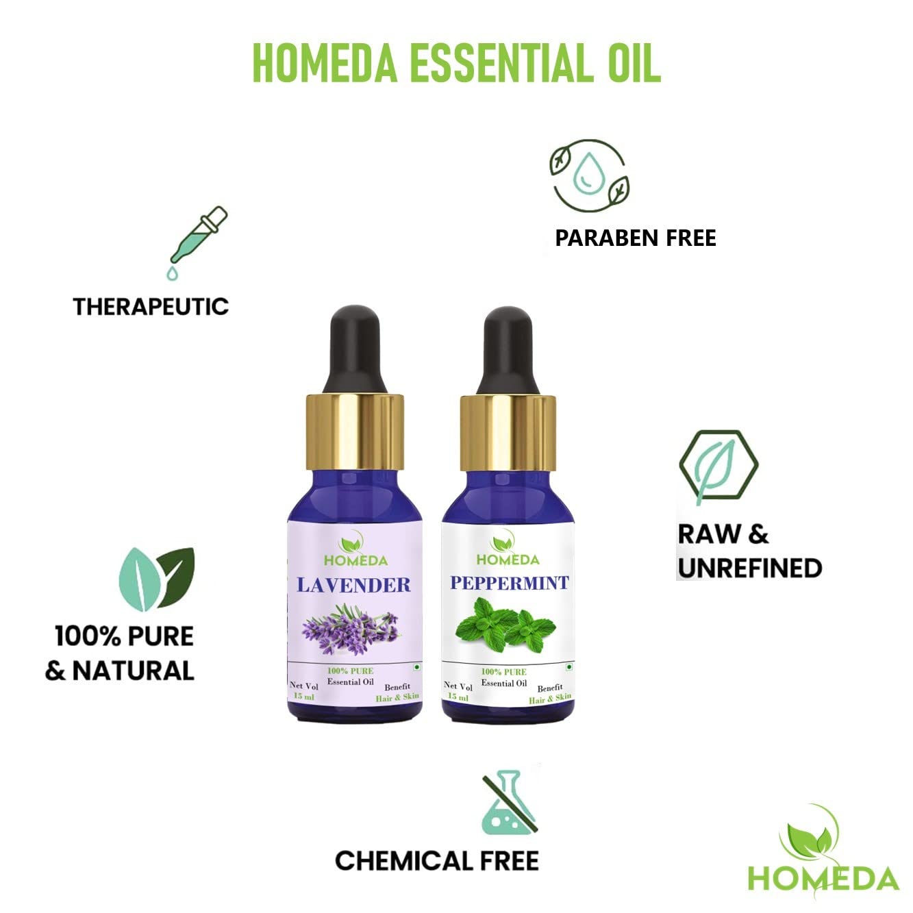 Homeda Peppermint Essential Oil and Homeda Lavender Essential Oil Known for its classic aroma and highly versatile use. Lavander oil is also has many topical uses that help to unwind enhance hair growth and reduce dandruff. Lavendar oil is a perfect choice for addition in body creams and moisturisers to enjoy nourished and healthier state of skin. How to Use - Add 5-6 drops pepermint and Lavender esstinal oil for diffuser in 10-15 ml carrier oil of your choice and gently massage on scalp and hair to prevent hair fall and promote hair growth. Homeda Pepermint esstinal oil for hair and Lavender Essential Oil helps in good sleep rub a drop of lavender oil on your pillow. Lavender aroma oil helps in peaceful and relaxed sleep. Homeda lavanda oil (levender oil) Pure and Natural Essential Oil Extracted From Lavender Flower Through Steam Distillation Method No Added Color and Biodegradable.