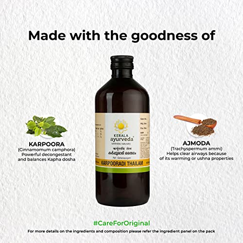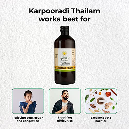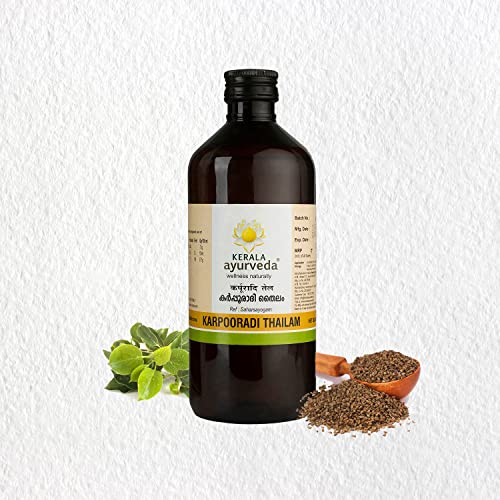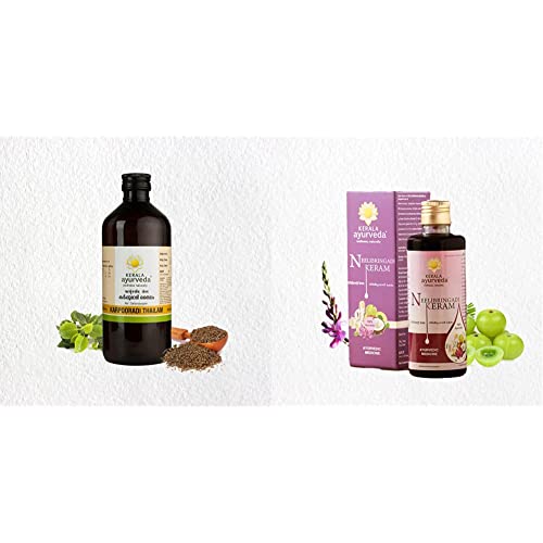 - Kerala Ayurveda Karpooradi Thailam 450ml | Chest Rubbing Oil | Herbal Oil for Cough & Cold | For Easy Breathing | Natural Congestion Relief | With Kapoora Ajmoda and Coconut Oil |Karpoora Cinnamomum camphora Ext. 7.5 g Kera thailam Coconut oil Kr. Ol. 100 ml Ajmoda Trachyspermum ammi Fr. Pst. 37.5 gKerala Ayurveda Neelibringadi Keram 200 Ml| Daily Hair Oil With Bringaraj Neeli Karnasphota And Amla | Coconut Oil Base | Delays Premature Greying Reduces Dandruff And Strengthens Hair|Neelibringadi Keram is one of the most famous Ayurvedic preparations that is renowned for its usefulness and efficacy in hair care. This Ayurvedic formulation in various forms has been used by generations of men and women to help keep hair healthy and strong and avoid greying. Neelibhringadi Thailam is known to contain potent ingredients that help prevent scalp issues and encourage the growth of thick and lustrous black hair as per traditional medicine. Anyone who wishes to look good would want hair that is strong and healthy. Hair that is long strong and well-nourished is what everyone desires. Hair problems like weak hair premature greying hair fall can affect a personâs appearance. Those who suffer from hair problems look for various remedies to help them. Using herbal hair oil made from Ayurvedic ingredients is a natural way to keep hair healthy. Neelibhringadi Keram is an Ayurvedic hair oil that can help nourish your hair and make it healthy.