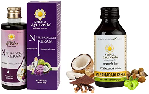 Kerala Ayurveda Neelibringadi Keram 200 Ml| Daily Hair Oil With Bringaraj Neeli Karnasphota And Amla | Coconut Oil Base | Delays Premature Greying Reduces Dandruff And Strengthens Hair|Neelibringadi Keram is one of the most famous Ayurvedic preparations that is renowned for its usefulness and efficacy in hair care. This Ayurvedic formulation in various forms has been used by generations of men and women to help keep hair healthy and strong and avoid greying. Neelibhringadi Thailam is known to contain potent ingredients that help prevent scalp issues and encourage the growth of thick and lustrous black hair as per traditional medicine. Anyone who wishes to look good would want hair that is strong and healthy. Hair that is long strong and well-nourished is what everyone desires. Hair problems like weak hair premature greying hair fall can affect a personâs appearance. Those who suffer from hair problems look for various remedies to help them. Using herbal hair oil made from Ayurvedic ingredients is a natural way to keep hair healthy. Neelibhringadi Keram is an Ayurvedic hair oil that can help nourish your hair and make it healthy.Kerala Ayurveda Nalpamaradi Keram 200ml | Face & Body Oil | Removes Tan and Dark Spots | With Nalpamara Haridra Usira Amla Manjistha Raktachandana | Coconut Oil Base |Nalpamaradi Keram is a classical Ayurveda formulation. A unique blend of various herbs It contains ingredients such as Turmeric and Sandalwood renowned for skin care