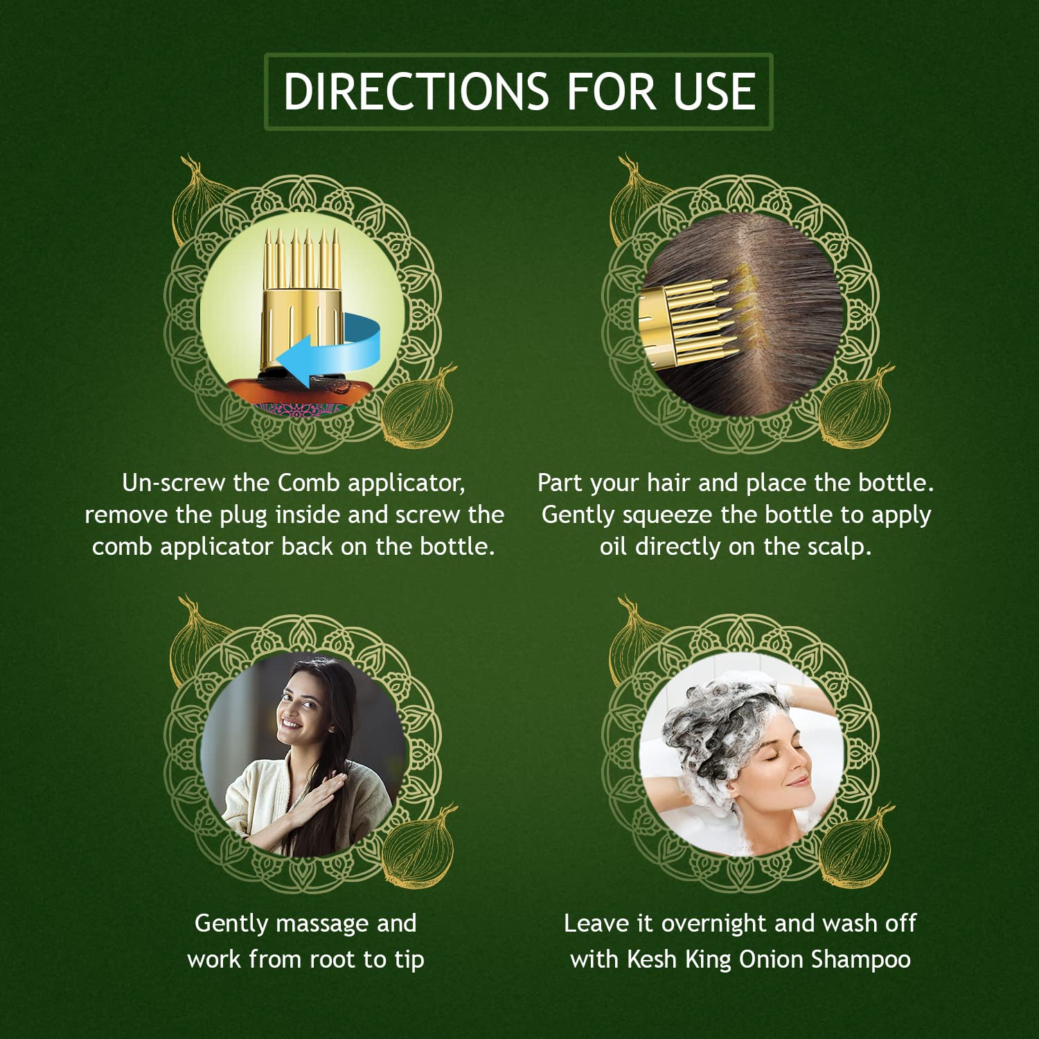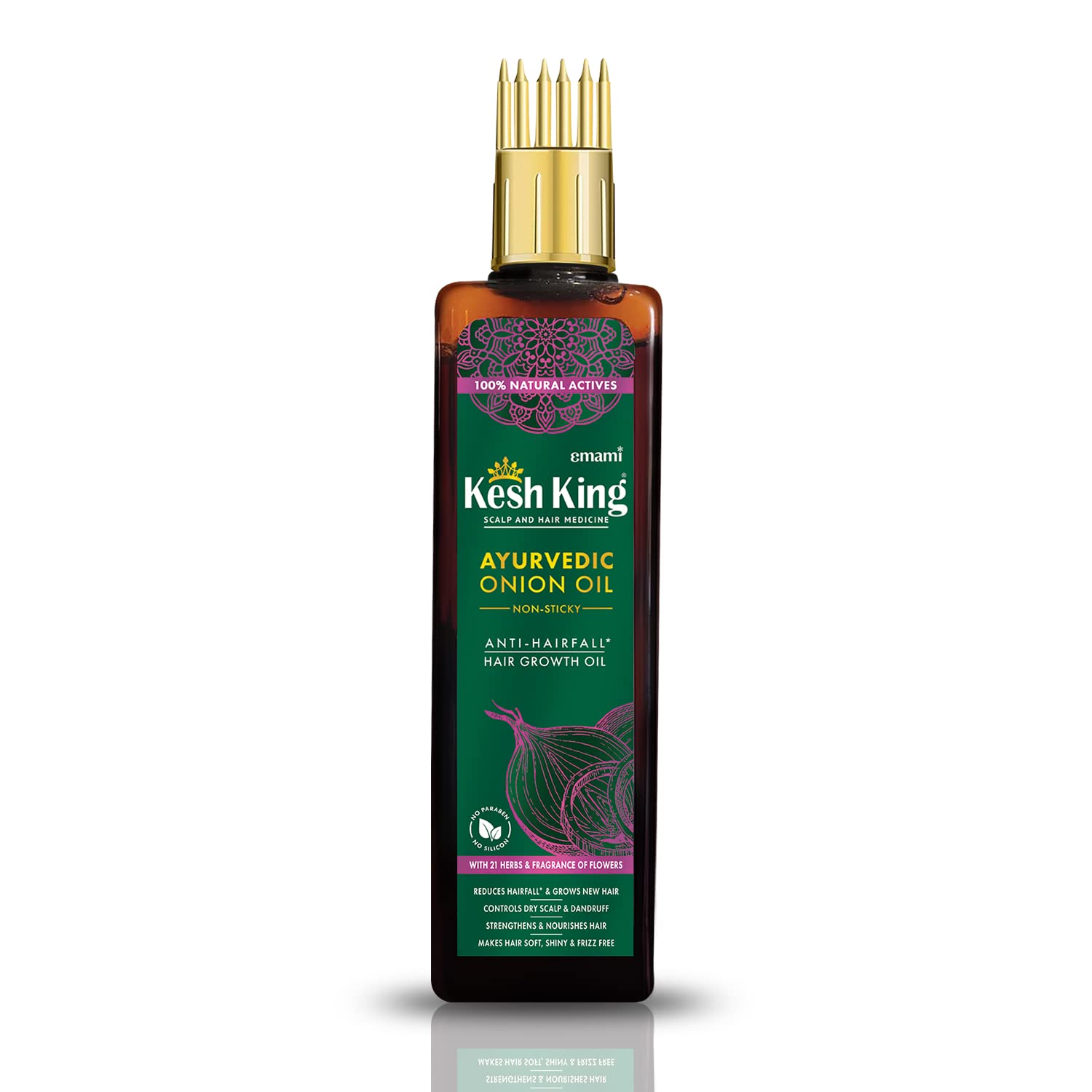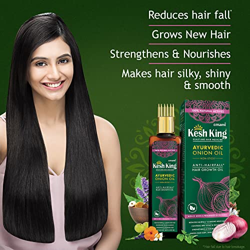 Kesh King Ayurvedic Onion Oil is the 1st onion oil that has been made by following Authentic Ayurvedic Texts. It is a unique and potent blend of 21 rare ayurvedic herbs like Bhringraja Methi Jatamansi etc. and Onion Oil that works together to revive your crowning glory. It has been designed for optimal hair growth hair fall control & curing other hair problems like dandruff premature greying of hair and frizzy hair. Regular use helps improving hair's texture making it fuller silkier shinier & stronger and also improves the health of the scalp. The non-sticky and non-greasy the formulation comes with a flowery fragrance to provide a pleasant experience. It is free from toxins like parabens sulphate silicone and synthetic dyes. The oil can be used for all hair types and is a one-stop solution to hair problems for your entire family.