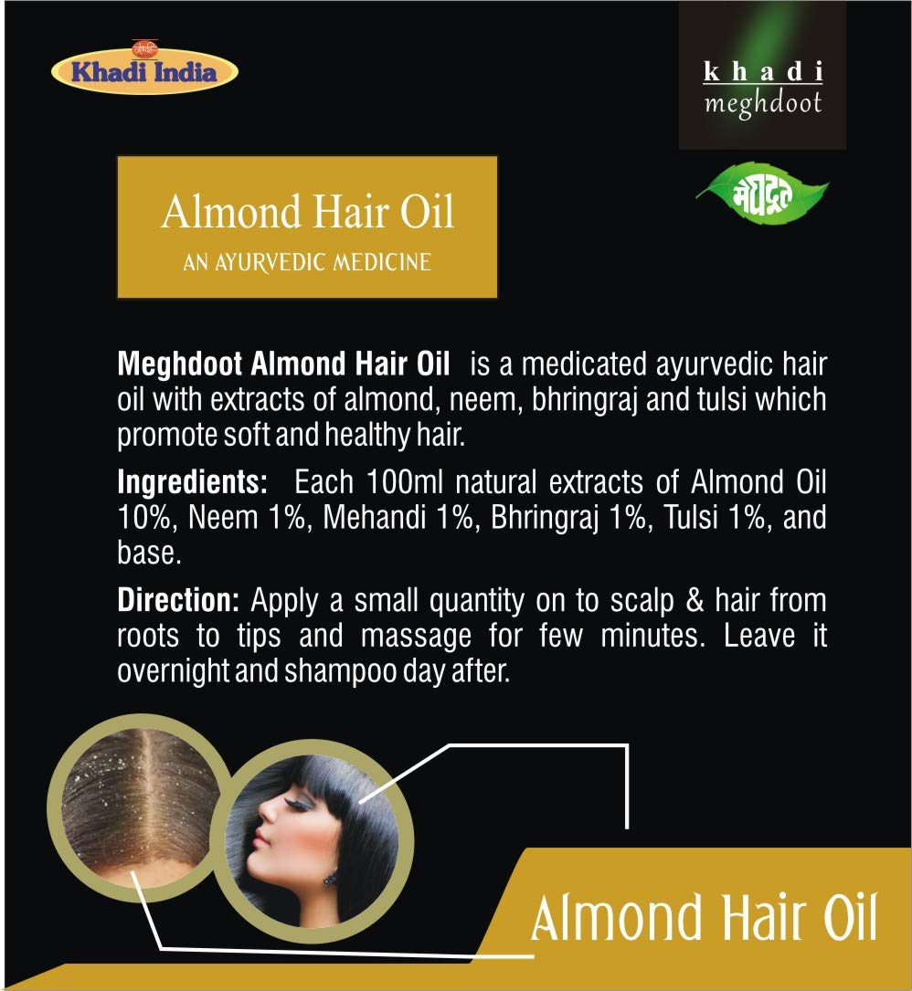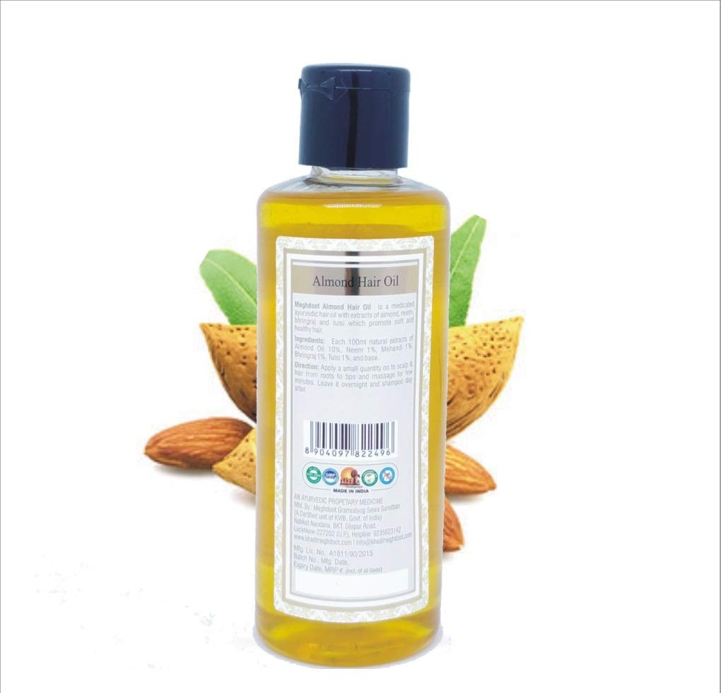 Meghdoot Almond Hair Oil is a medicated ayurvedic hair oil with extracts of almond neem bhringraj and tulsi which promote soft and healthy hair. Ingredients Almond Oil Neem Mehandi Bhringraj Tulsi