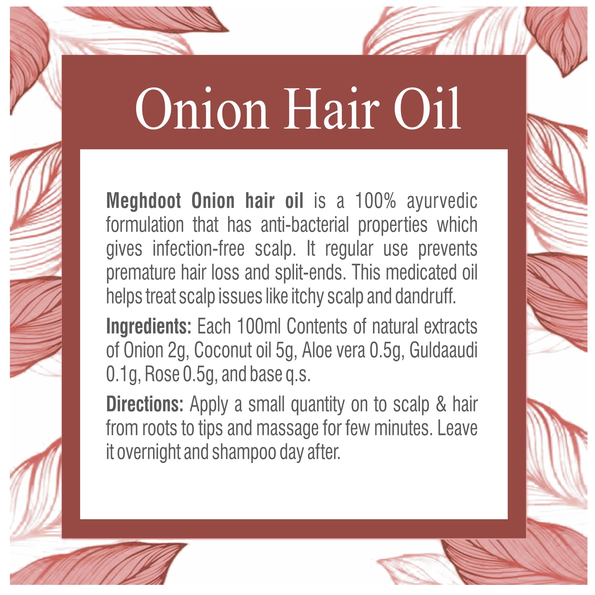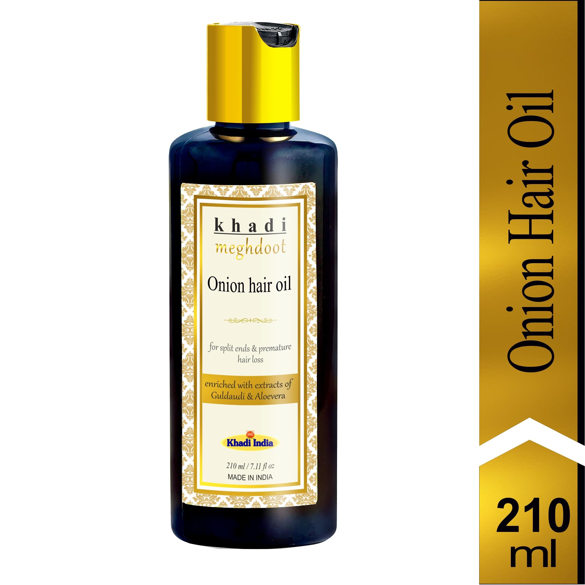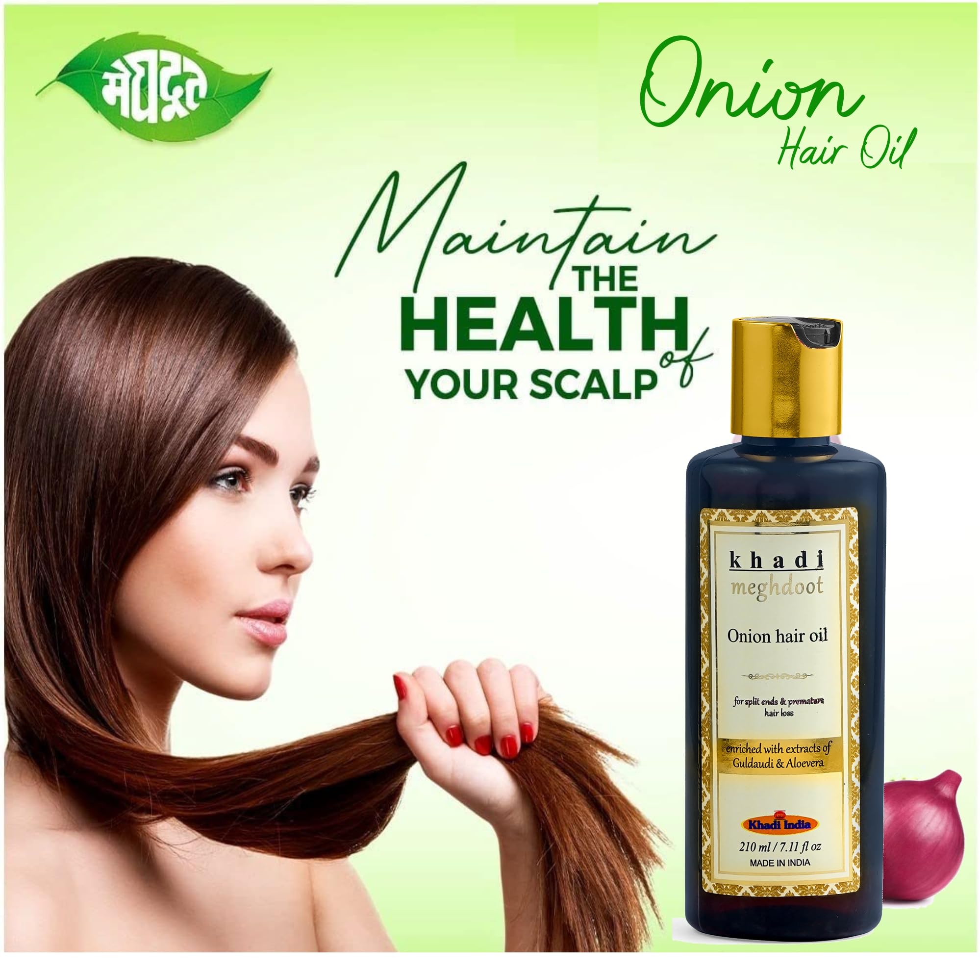 Khadi Meghdoot Onion Hair Oil is a potent blend of natural ingredients specifically designed to tackle split ends premature hair loss and promote overall hair health. Enriched with the power of onion extract this 100% Ayurvedic hair oil nourishes your scalp and strengthens hair follicles encouraging healthy growth and reducing hair thinning.Color-safe and always free of sulfates phosphates silicones and parabens. Touchable Softness & Shine - You (and they) won’t be able to help it. Silky Smooth Style - Tame flyaway’s and course stubborn hairs for a naturally smooth look. Subtle Seductive Natural Aroma - With Growth & Shine you can be confident in the light and subtly seductive Aroma of your hair no matter what the day or night has in store. ONION Hair Oil - For ALL TYPE OF HAIR - Ideal to Boost Hair Growth Anti Hair Fall Control & Removes Dandruff. Stop hair fall hair thinning healthy and dense hair with Khadi Meghdoot ONION Hair Oil.