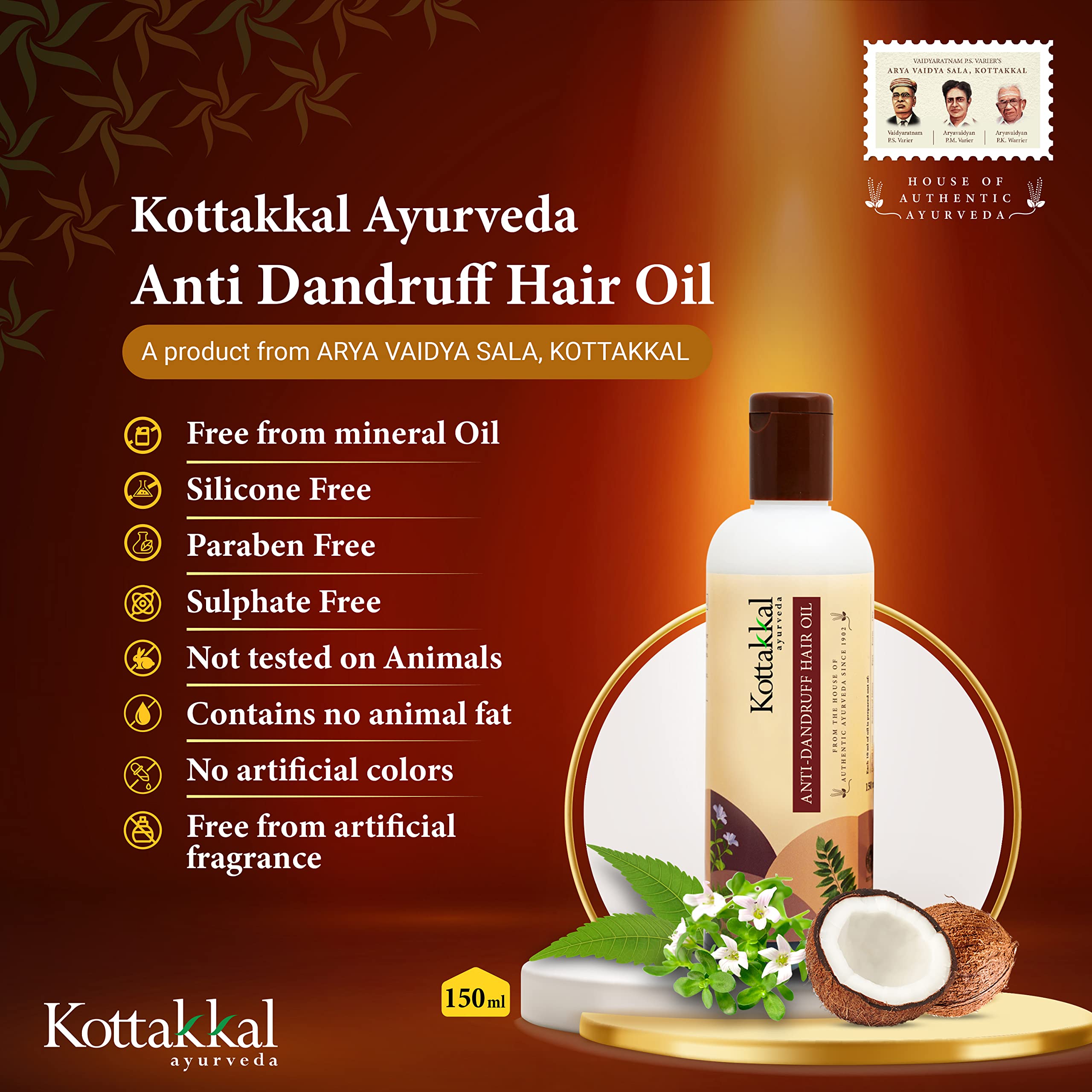 CONTENT: Kottakkal ayurveda Anti-Dandruff Hair Oil (Pack of 1). Paraben & Sulphate Free No Artificial Colour & Fragrance - 150 ml BENEFITS: The regular use of this oil helps to get rid dandruff and related itchiness. It also helps to reduce inflammation due to the dandruff and regulate hair growth. NATURAL: This Anti-Dandruff Hair Oil is prepared with: Brahmi Neem Kadipatta Ayyapala Coconut oil a. Brahmi Brahmi has potent anti-fungal activity helps to control dandruff. It is proven anti-inflammatory in action which helps to relieve the itchiness and inflammation of scalp due to dandruff. Also possess Antioxidant Activity. b.Neem | Nimba- Neem has Anti-dandruff Anti-bacterial Anti-fungal actions. c.Kadipatta |Kalasaka - It has anti-fungal and helps to control dandruff anti-inflammatory properties strong anti-oxidant activity and Helps to regulates hair growth d. Ayyapala | Swetakutaja It has Anti dandruff activity. Anti-inflammatory in action. It has wound healing activity helps to repair minor rashes of the scalp e. Coconut oil | Keratailam The lauric acid in coconut oil act as antifungal in action. Coconut oil is a potent hair growth promoter and moisturizes the hair . It provides protection to hair from damage caused by hygral fatigue. DIRECTION FOR USE: Take 5 10 Ml of the oil and apply over the scalp. Massage for 5 Minutes. Wash after 15 Minutes. USAGE: For external use only Directly from the manufacturer Vaidyaratnam P S Varier's ARYA VAIDYA SALA KOTTAKKAL.