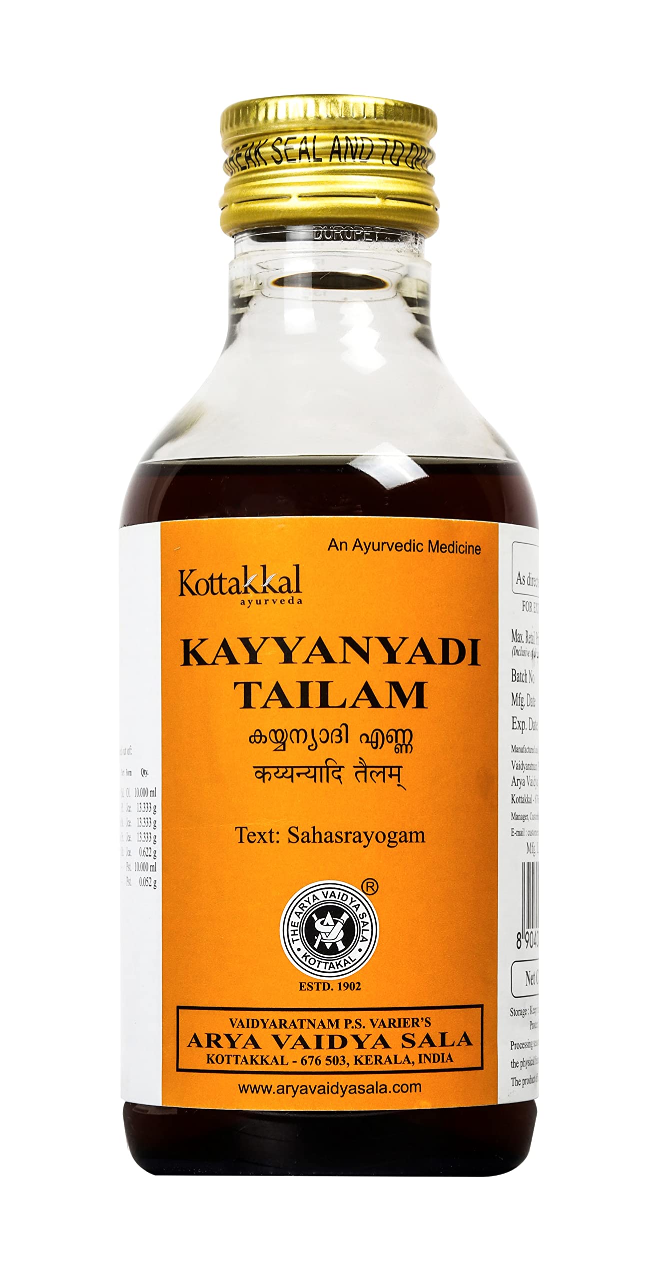 Kottakkal ayurveda Kayyanyadi Oil Herbal Combination Of Natural Ingredients Ideal For Hair & Skin - Pack Of 1 (200Ml)