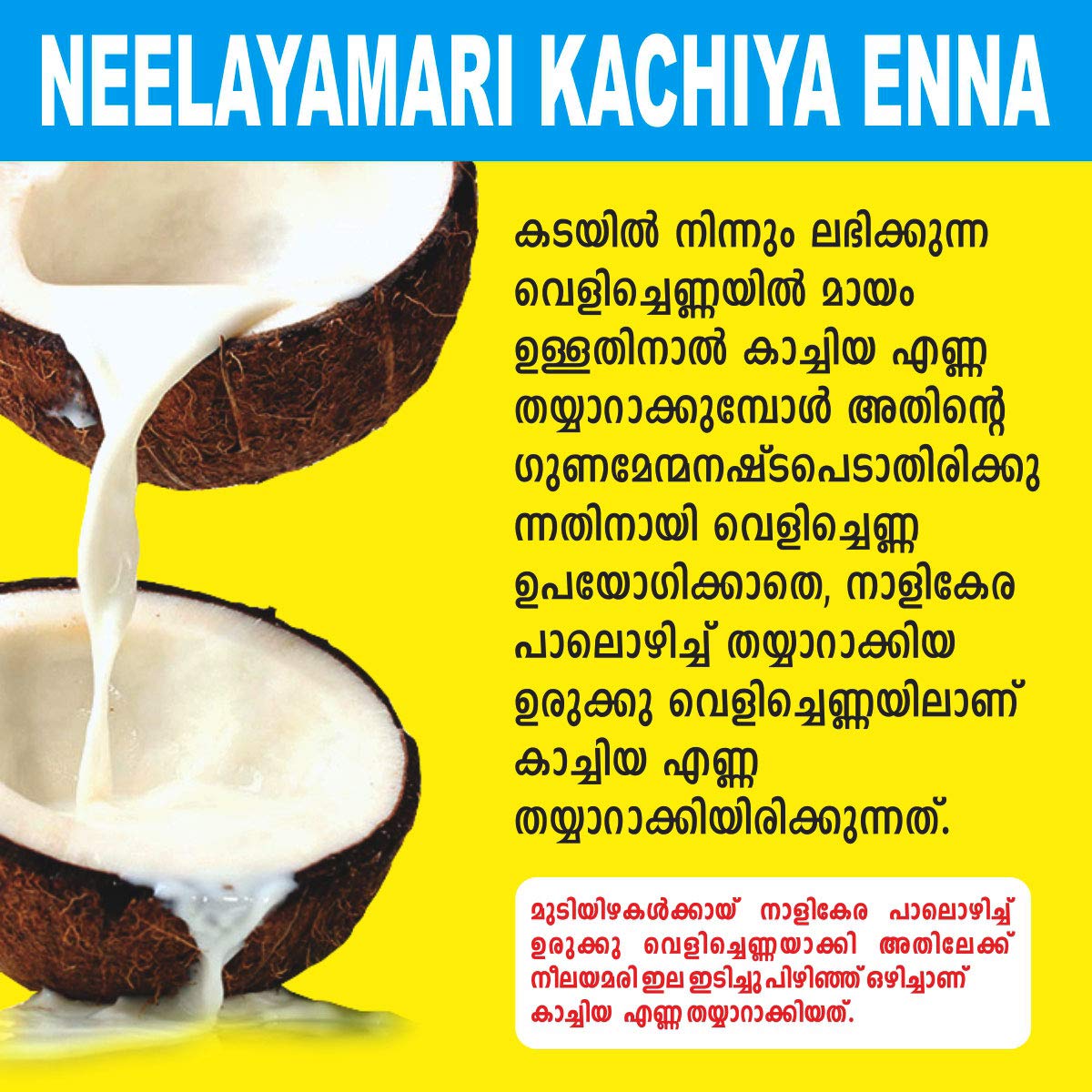 Neelayamari Kachiya Enna for hair and scalp conditions like hairfall dandruff etc.It promotes hair growth prevents itching on the scalp reduces dandruff and conditions your hair.