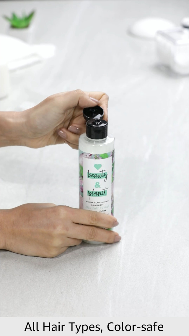 Excess hair breakage weighing you down? Don't worry|| we've got your back|| with our Hair Fall Control conditioner. This Onion|| Blackseed oil & Patchouli conditioner is made with plant-based detanglers and infused with 100% organic coconut oil. It helps reduce hair fall by 90%* and makes the hair stronger with every wash. How to use? You know it - After shampooing|| spread the conditioner through your gorgeous wet locks. Avoid the roots and rinse. Go easy on the tap! For faster results|| pair it with Love Beauty & Planet's Onion|| Blackseed Oil & Patchouli shampoo. Our goal is a carbon footprint so small|| it's like we weren't even here. We|| at Love Beauty & Planet have started our journey by loading our products with natural goodness and packing it in bottles made from 100% recycled plastic. Our delicate scents are infused with natural and ethically sourced oils and extracts. All our bottles are made up of 100% recycled plastic waste and are completely recyclable. Our caps and pumps aren't made from recycled plastics yet|| but we're working on it. Our products are free from added harsh chemicals like parabens|| dyes and sulfates. Love Beauty & Planet is PETA Certified cruelty-free and vegan. Globally|| Love Beauty & Planet does not test on animals. We are committed to acts of love that make our planet cleaner|| greener and more beautiful.*OLD