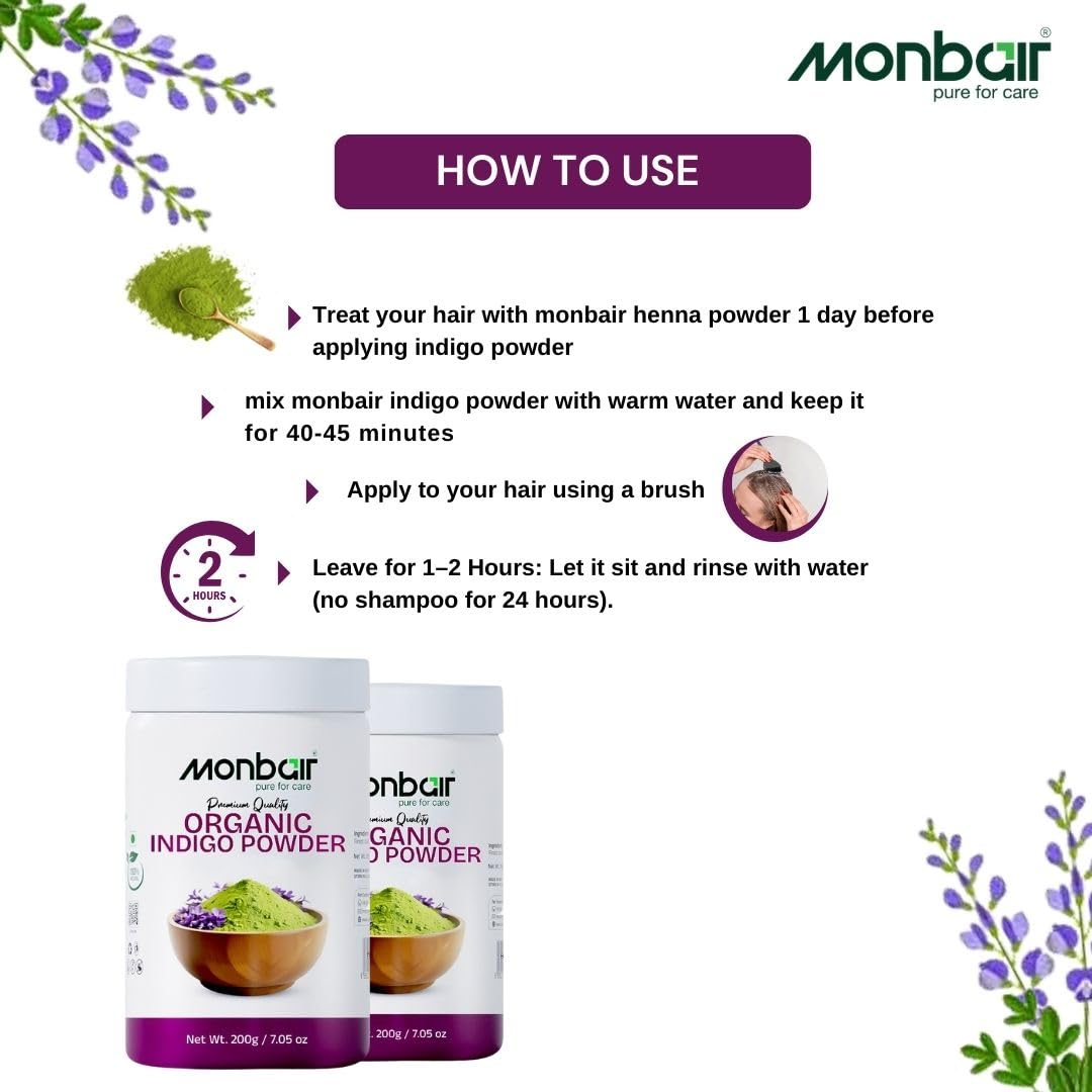 Monbair indigo and henna powder You can use for colouring the hair to get your desired hue of hair colour Indigo can be applied in one step or two step process to get different tones such as Black Brown dark brown etc. It gives natural and attractive color to hair without any chemicals. Indigo dispels heat and have a soothing effect and revitalizes the hair. Treat your hair with Indigo. After rinsing your hair let it dry. Mix Monbair Indigo Powder in warm water to prepare a paste. Apply on your hair using gloves if applying with your hands or a spatula. Leave on for 45 minutes or more depending on preferred intensity. Itâs advisable to keep it on hair for up to 2 hours to get rich black color. Rinse thoroughly with water. Wash your hair with a cleansing shampoo the next day.