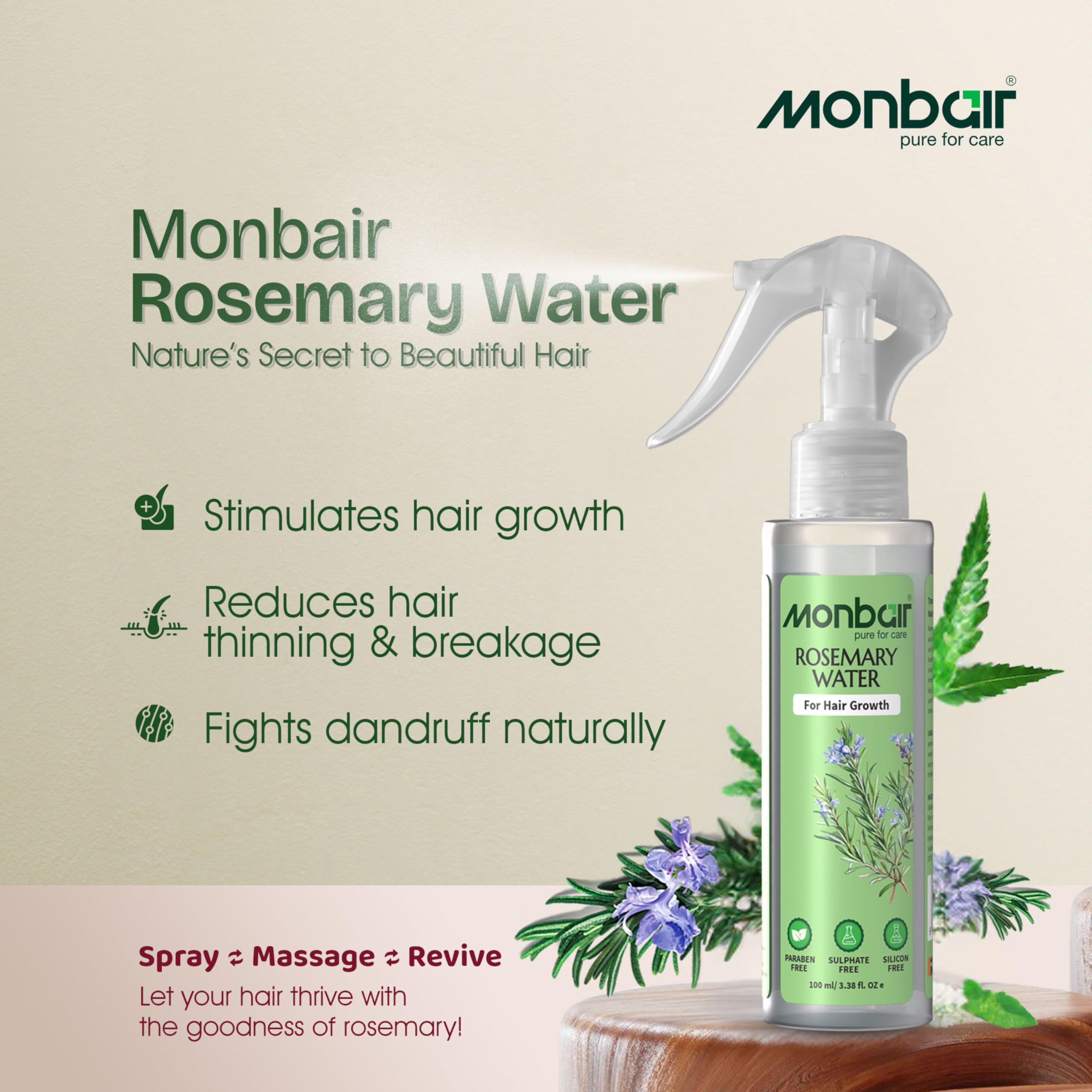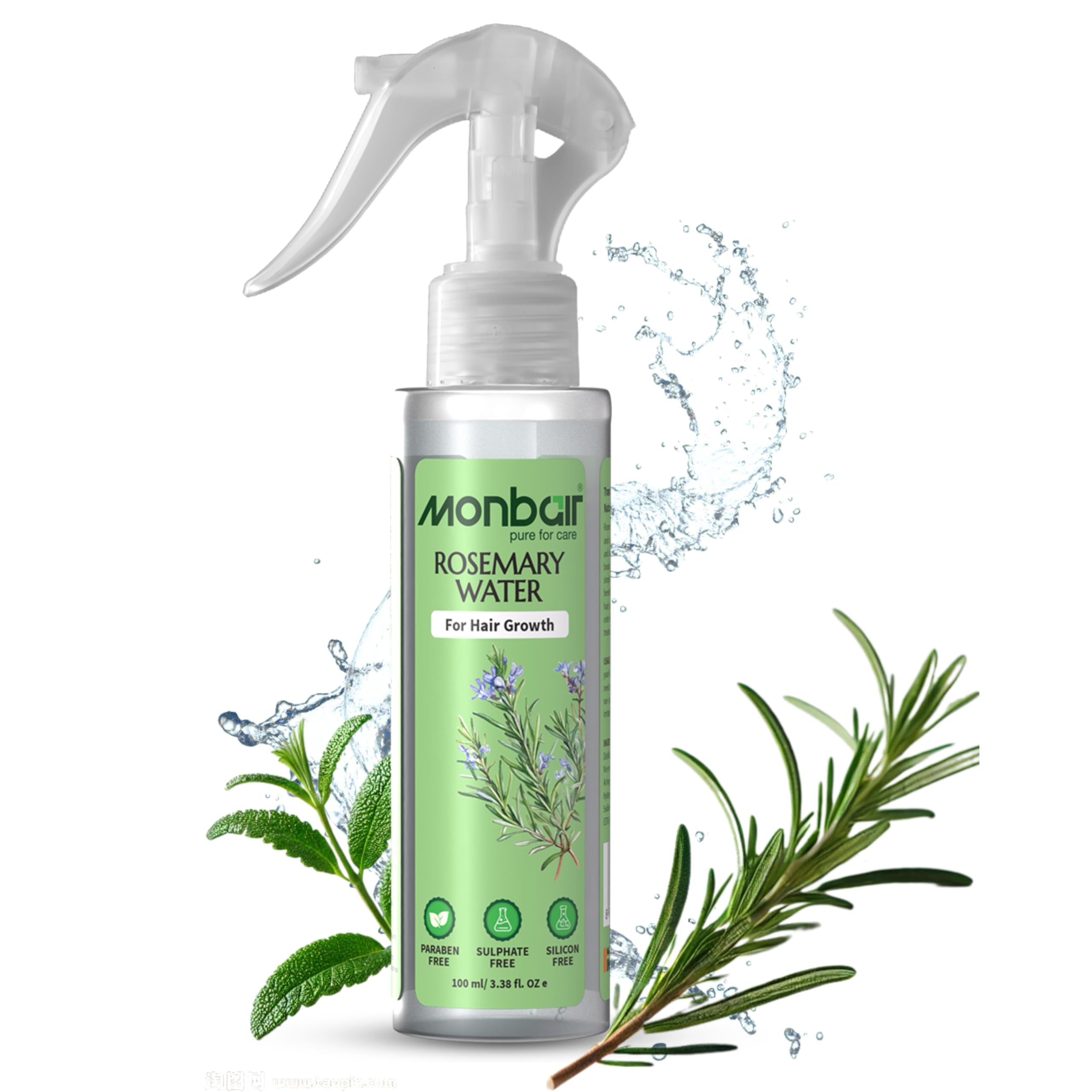 HomeHealth & PersonalHair CareHerbal Hair OilMonbair Rosemary Water for Hair Growth - Infused with Bhringraj Brahmi Ashwagandha Neem and Tea Tree Oil | Paraben-Free Sulfate-Free Silicone-Free - 100 ml