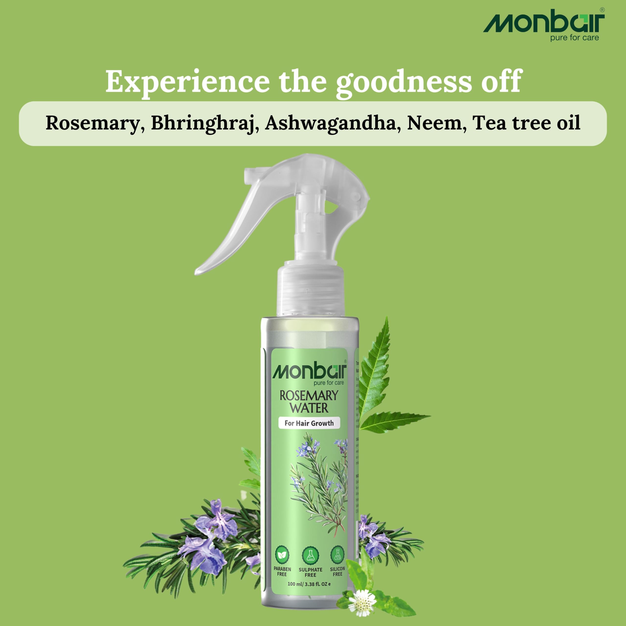 Monbair Rosemary Water for Hair Growth - Infused with Bhringraj Brahmi Ashwagandha Neem and Tea Tree Oil | Paraben-Free Sulfate-Free Silicone-Free - 100 ml
