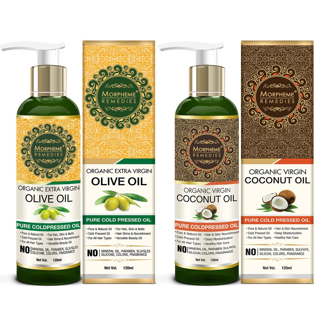 Olive OilFrom moisturizing your skin to helping you fight the appearance of aging experts highlight some of the biggest beauty benefits of olive oil.Olive oil contains a good amount of vitamin E an antioxidant that protects the skin from various external factors.Olive oil in combination with a few other ingredients can work wonders to keep your hair healthy. The oil is rich in vitamin E that helps fight hair loss. Just rub a few drops of olive oil on flyaway ends after styling for an extra-glossy finish.Massage with Olive Oil can relief fatigue and strengthen the bones.Olive Oil is good for Cracked Heels & Body Massage Oil.You can apply the oil directly to your face for removing makeup or as a pre shave oil.Virgin Coconut oil is pure unrefined cold pressed oil extracted from fresh coconut milk. The cold process method ensures that all the vital nutrients & the natural goodness of fresh coconuts are retained. This is considered the highest quality and healthiest form of coconut oil.Coconut oil can help improve the texture evenness of tone pore size and luminosity of your skin. Coconut oil helps keep your hair fully moisturized it promotes full growth and creates strong hair whilst keeping the scalp free from flakes.Coconut oil acts as an antioxidant. It protects skin cells from uv light pollution and the negative effects of smoke and other free radicals. It's anti-fungal anti-viral and anti-bacterial properties make it an excellent oil for baby massage.RECOMMENDATIONS: Should be used on regular basis for best and noticeable results.