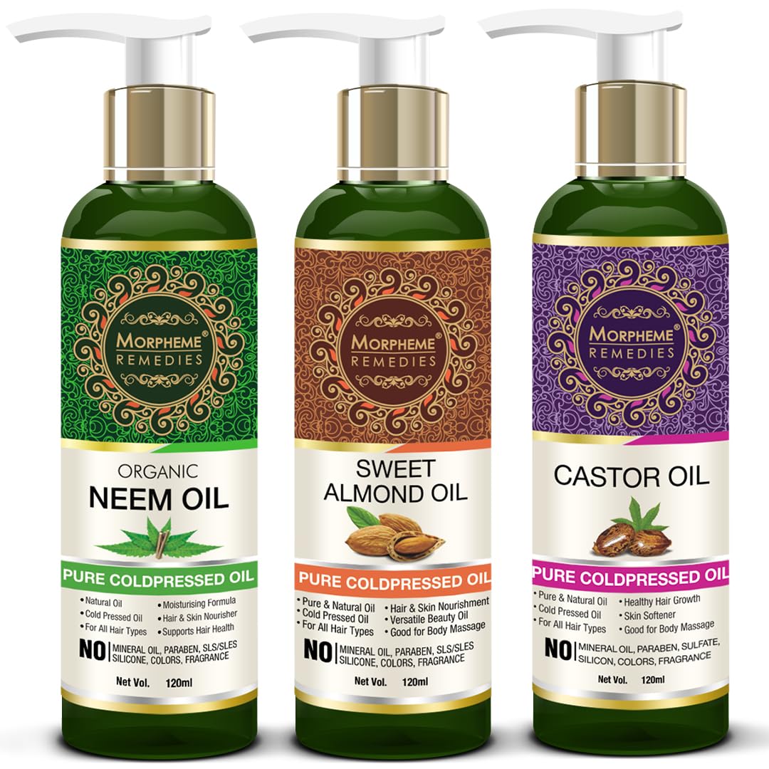 Morpheme Remedies Castor Oil is cold pressed from the seeds of the plant Ricinus Communis. Many people are already aware of the various health benefits of castor oil. However there are many different types of castor oil such as black castor oil hydrogenated castor oil and castor oil granules. One of the most popular types of castor oil is cold pressed castor oil since this is considered to be the oil with the greatest concentration of nutrients. Neem oil provides effective solutions for damaged skin and hair. The anti-bacterial formula of this natural product makes it an amazing smoother for the skin as well as for the hair.Neem has regenerative properties which help in reducing hair fall. An oil massage to the scalp using neem oil can increase the blood circulation in the scalp and help in enhancing the rate of hair growth.Its herbal moisturizing formula gives you a well toned skin that is free of cracks and freckles.Regular application of the oil can also help to resolve thinning issue as the oil promotes hair growth and strengthens hair from the roots.Neem being one of the most powerful anti-fungal agents makes it an excellent oil for skin infections.The sweet almond oil that comes exclusively from edible almonds (Prunus amygdalus var. dulcis) selectively cultivated for their sweet taste. It is the oil popularly used for skin and hair care. It has many culinary uses too. The bitter almond oil is extracted from the bitter almonds and do not hold much benefits. Almond oil is a mild hypoallergenic oil that can be safely used even on baby skin. In fact it is the best massage oil for infants.It is excellent for removing makeup even from the tender area around the eyes. It nourishes your skin and makes it smoother and softer.