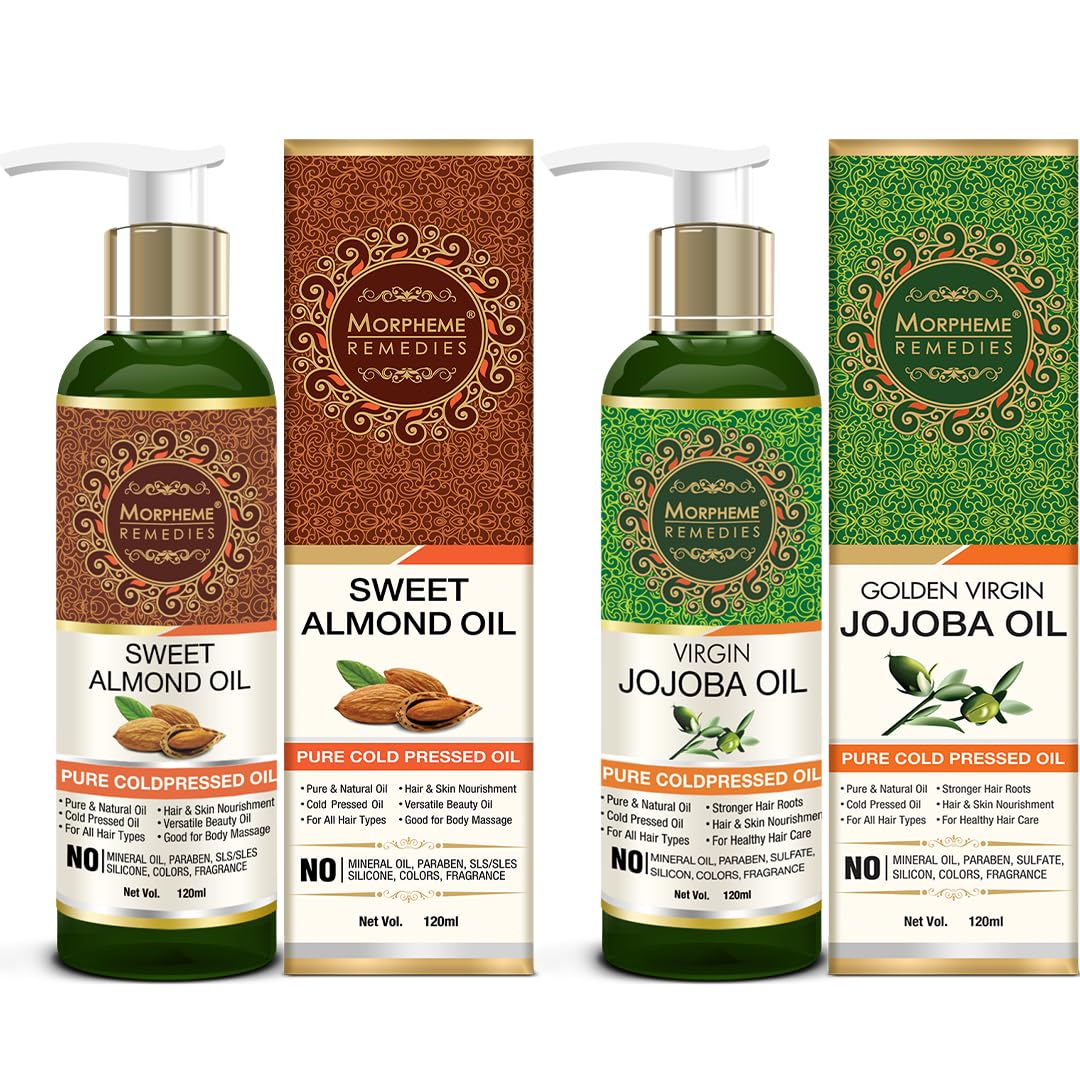 Jojoba Oil strengthens hair and restores resilience adds moisture body and shine. It is beneficial for all hair types enriches skin and leaves it visibly radiant. It also soothes and helps protect extremely dry chapped skin and lips.Promotes Hair Growth: Apply to scalp to stimulate follicles as a natural hair growth treatment.Versatile Beauty Oil: It can be used head-to-toe for hair face and total body beauty care.De-tangle knots remove stubborn makeup relieve itchy sunburn and more.Long Lasting Nourishment: It is an ideal moisturizer for a variety of skin types and conditions- including sensitive skin types.The sweet almond oil that comes exclusively from edible almonds (Prunus amygdalus var. dulcis) selectively cultivated for their sweet taste. It is the oil popularly used for skin and hair care. It has many culinary uses too. The bitter almond oil is extracted from the bitter almonds and do not hold much benefits. Almond oil is a mild hypoallergenic oil that can be safely used even on baby skin. In fact it is the best massage oil for infants.It is excellent for removing makeup even from the tender area around the eyes. It nourishes your skin and makes it smoother and softer. If you have dark circles and bags under your eyes almond oil can come to your aid. Apply the oil every night before going to bed. Regular application of almond oil on your skin makes your skin feel younger and fresher within no time. The vitamin E in almond oil nourishes and shields the skin from harmful rays of the sun. Please note - This oil is non edible and is meant for cosmetic purpose only.