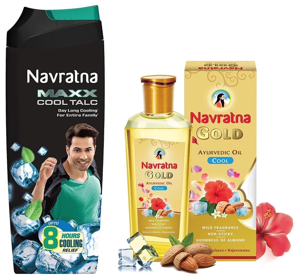 Navratna Maxx Cool Talc |Ice Cooling Effect |For Last Lasting Freshness and Fragrance|Instant Sweat Control 400gmPresenting Navratna Maxx Cool talc enriched with natural ingredients that keep you cool for entire day. It is the only cooling talcum powder in India with sweat Activated cooling technology. Now stay cool and fresh for entire day.Navratna Gold Ayurvedic Oil |Non Sticky and Non Greasy |Mild Fragrance| Goodness of Almonds and 9 Ayurvedic Herbs |Relieves Body Aches Sleeplessness Headache and Fatigue 300mlNavratna Gold is a marvel of ayurveda. This light non-sticky Oil is a blend of premium herbs and exotic flowers. Its blissful massage brings alive the cooling of mountains and smell of exotic flowers to refresh and rejuvenate you. Whenever you need relief from headache and stress try this enriching experience