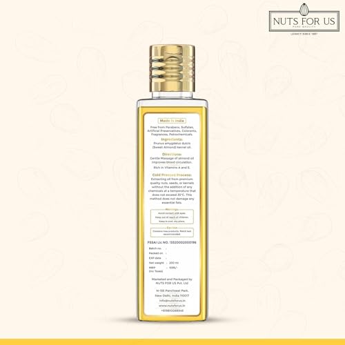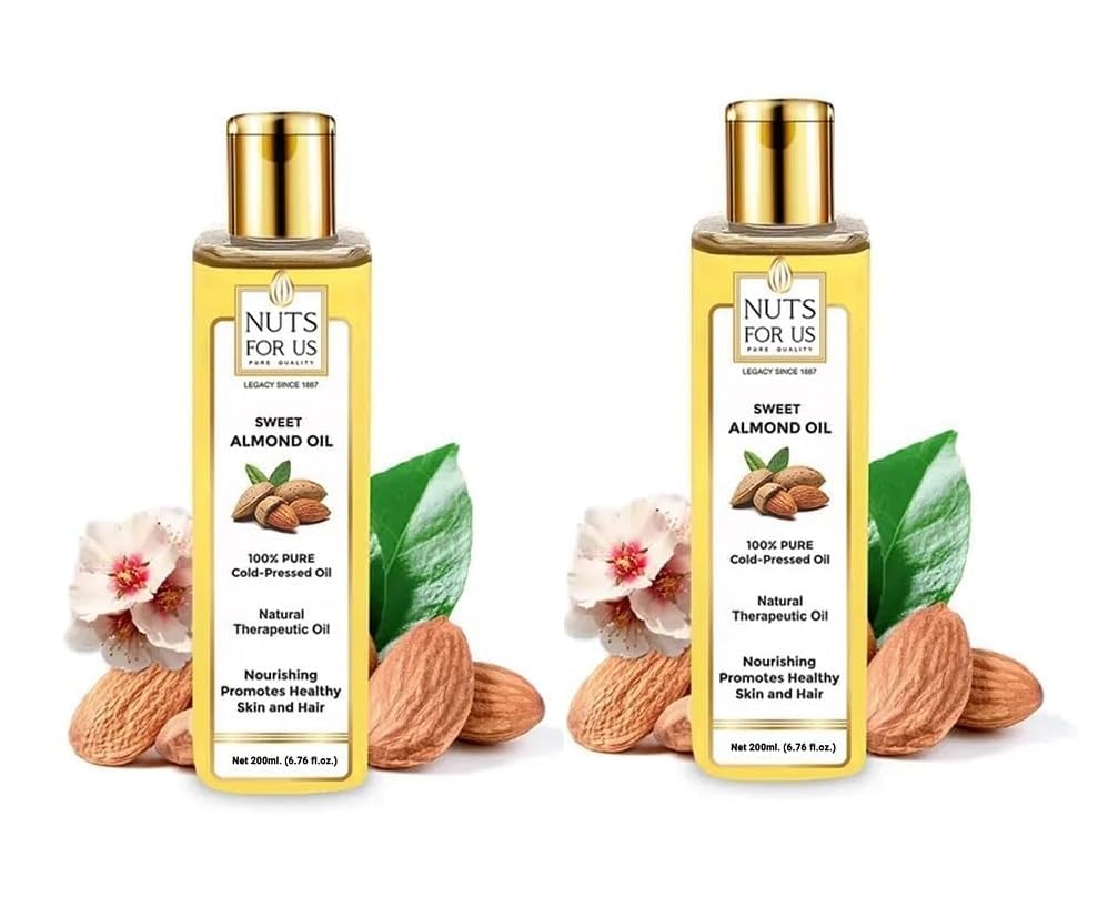 Nuts For Us Cold Pressed Sweet Almond Oil sourced from the finest almonds this pure natural badam tel is rich in vitamins antioxidants and essentil fatty acids that provide a multitude of benefits. Perfect for hair growth radiant skin and therapeutic massage this almond oil is a must-have in your self-care routine. Nuts For Us Cold Pressed Sweet Almond Oil (200ml) comes in a pack of 2 ensuring you have enough to enjoy long-lasting benefits. Use it for daily hair care massage therapy or as a natural face and body moisturizer for healthier glowing skin.