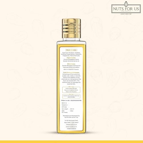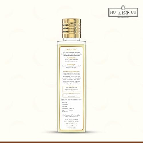 Nuts For Us Coconut Oil Pack of 1 is a natural cold-pressed oil derived from handpicked and hand sorted coconuts. Our philosophy of source to skin at Nuts For Us is embodied in our range of cold-pressed oils. Our cold-pressed Coconut Oil is derived with a method to retain to all natural and nourishing properties of the coconuts. Our oil is undiluted preservative free chemical free with no additives and no fragrance added. Our oil is certified and edible. Quantity is 100ml Form Sold is Liquid Made in India Cold Pressed Edible Coconut Oil. Vegetarian It is a natural cold-pressed oil derived from handpicked and hand sorted dried coconuts. Our oil is undiluted preservative free chemical free with no additives and no fragrance added. Consumption of one teaspoon of coconut oil every morning to improve digestion and boost energy levels for throughout the day.  This oil improves skin complexion and tone while reduces signs of aging. It can be used to prevent stretch marks during pregnancy and for others with dry skin syndrome. It can be used as a natural makeup remover and a night cream for medium to dry skin. It can be used as deep conditioner for hair. It enhances hair quality and boosts hair growth.oil is undiluted preservative free chemical free; It has no additives and fragrance. Nuts For Us Cold Pressed Sweet Almond Oil sourced from the finest almonds this pure natural badam tel is rich in vitamins antioxidants and essentil fatty acids that provide a multitude of benefits. Perfect for hair growth radiant skin and therapeutic massage this almond oil is a must-have in your self-care routine. Nuts For Us Cold Pressed Sweet Almond Oil (200ml) comes in a pack of 2 ensuring you have enough to enjoy long-lasting benefits. Use it for daily hair care massage therapy or as a natural face and body moisturizer for healthier glowing skin.