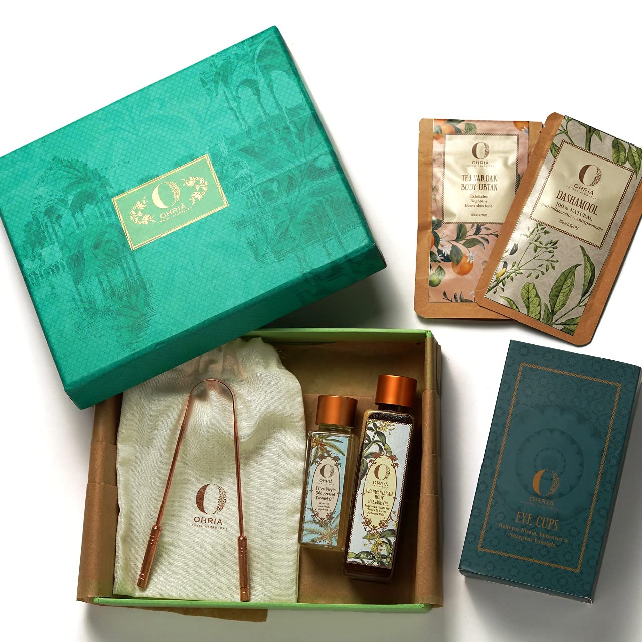 A holistic Ayurvedic detox box consisting of tools and products to empower your health by removing toxins on a daily basis. Incorporating these products and practices into your everyday regime will help your body be in rhythm & balance and will also remove toxins on a daily basis thus refraining from toxin accumulation. Also detoxification aids your body in seeking the optimum nutrition from food thus keeping you healthy. Detoxification additionally supports & promotes healthy skin and hair. The box is curated with the aim to return the body to its original healthy state: true luminous beauty supported by inner health. Dincharya Ritual: Oil pulling- Coconut oil Tongue scraping- Pure copper tongue cleaner Eye wash- Glass eye cups with Triphala powder Body Massage- Dhanwantaram Body Massage oil Exfoliation- Tej Vardak Body Ubtan Detox Bath- Dashamoola Powder