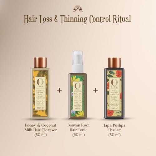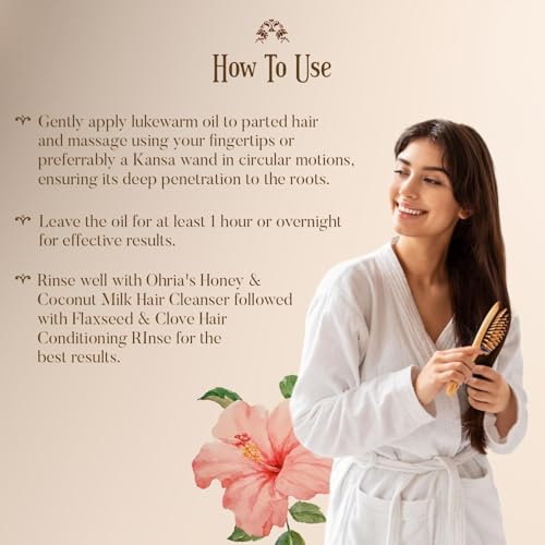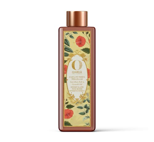 Japa Pushpa Thailam For Hair & Scalp Conditioning, Long term application promotes healthy growth and arrests premature graying. This unique oil is filtered on the 21st day. The hair feels healthy softened and strengthened with each application and hair fall is controlled. Anti hair fall and Growth Oil and Stimulate, Nourish, Strengthen. Ohria hair-care, pure and vital nutrients as hair super foods. No silicons, No mineral oil, No sulfates and No harmful chemicals for a healthy scalp and No product build up. Ohria cares with natural ingredients used in its purest, rawest and boldest form to give a lifetime of healthy, nourished and lustrous hair.