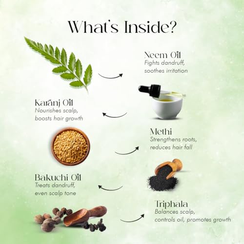A scalp conditioning treatment with herbs like neem Triphala Karanj Bakuchi Karpur extracted in sesame oil to control scalp infections and itchiness. Also balances flaky scalp conditions while Methi Nagarmotha Manjistha strengthen follicles and nourish dry hair to restore manageability health and shine.