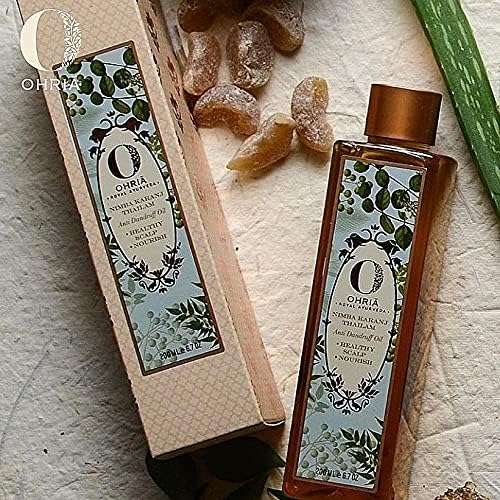 A scalp conditioning treatment with herbs like neem Triphala Karanj Bakuchi Karpur extracted in sesame oil to control scalp infections and itchiness. Also balances flaky scalp conditions while Methi Nagarmotha Manjistha strengthen follicles & nourish dry hair to restore manageability health and shine. Ohria hair oils are prepared by ancient Ayurvedic 21- days slow infusion process. Herbs are added on 1st 7th 11th and 20th day as per their heat resistance and other nutritional properties. This unique oil is then filtered on the 21st day. The medicinal properties of herbs clarify scalp and promote healthy growth by improving blood supply to the follicles.