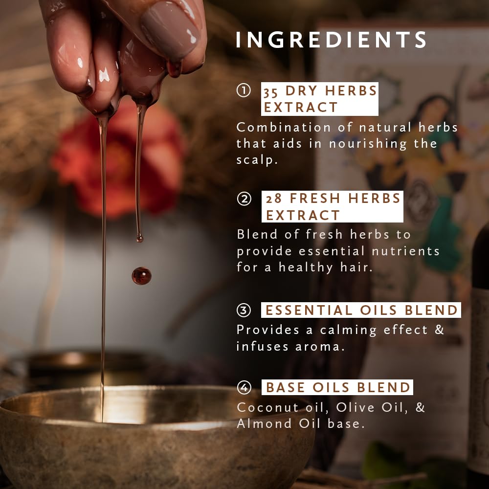 POWER OF 63 HERBS IN ONE OIL: A potent elixir handcrafted with 63 natural herbs including Bhringraj Brahmi Hibiscus Amla Ashwagandha and Neelambari to rejuvenate your scalp and strengthen hair from the root.