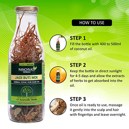 • HOW TO USE: 1. Pour 400 ml of coconut oil or any hair oil of your choice in the Jadi Buti Mix.2. Keep the bottle in the sun for 3- 4 days and allow the extracts of herbs to get absorbed into the oil. 3. Massage the oil gently into the scalp and hair with