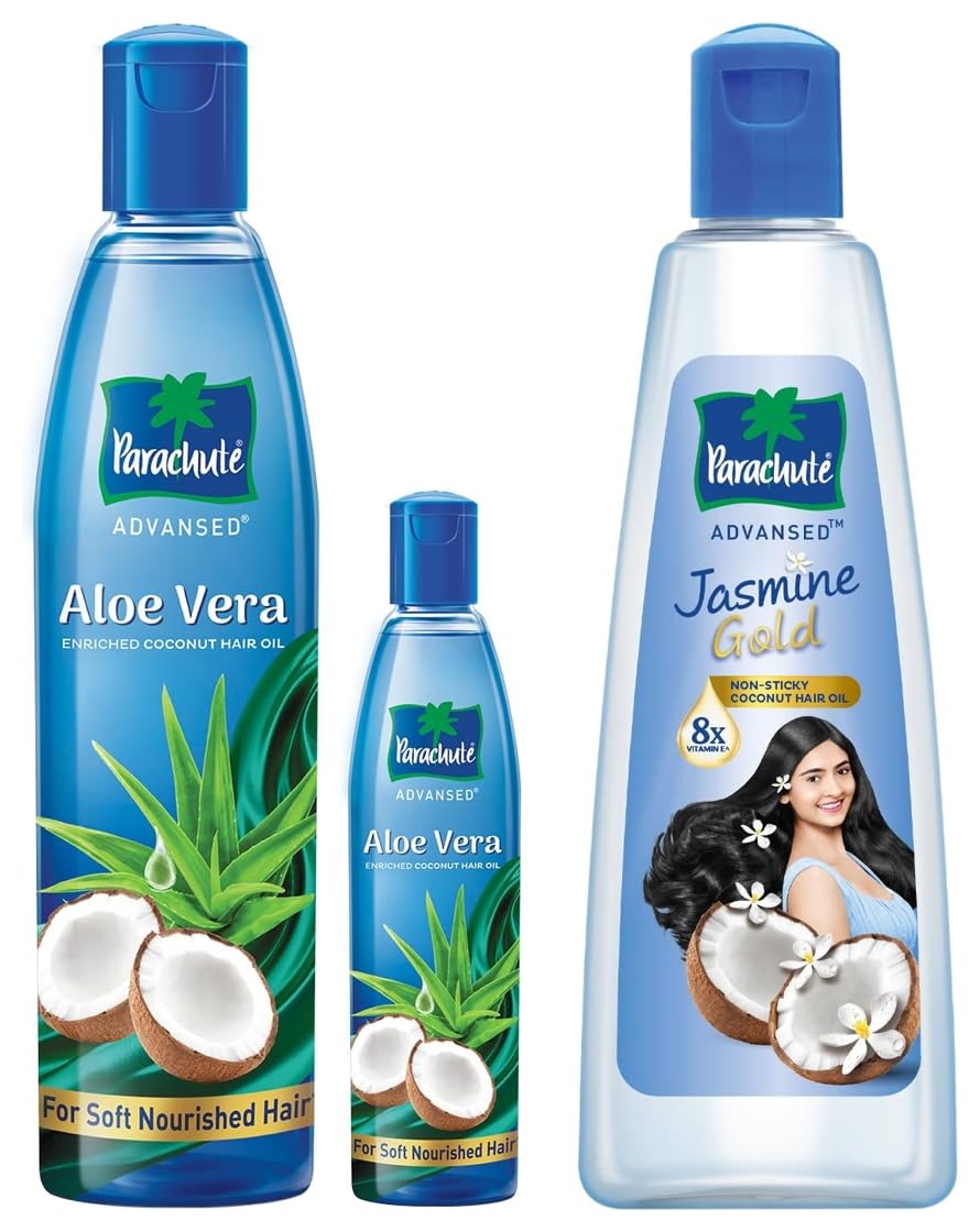 Parachute Advansed Jasmine Gold Coconut Hair Oil With Vitamin-E For Super Shiny Hair Non-sticky 500ml & Parachute Advansed Aloe Vera Enriched Coconut Hair Oil 250ml (Free 75ml)