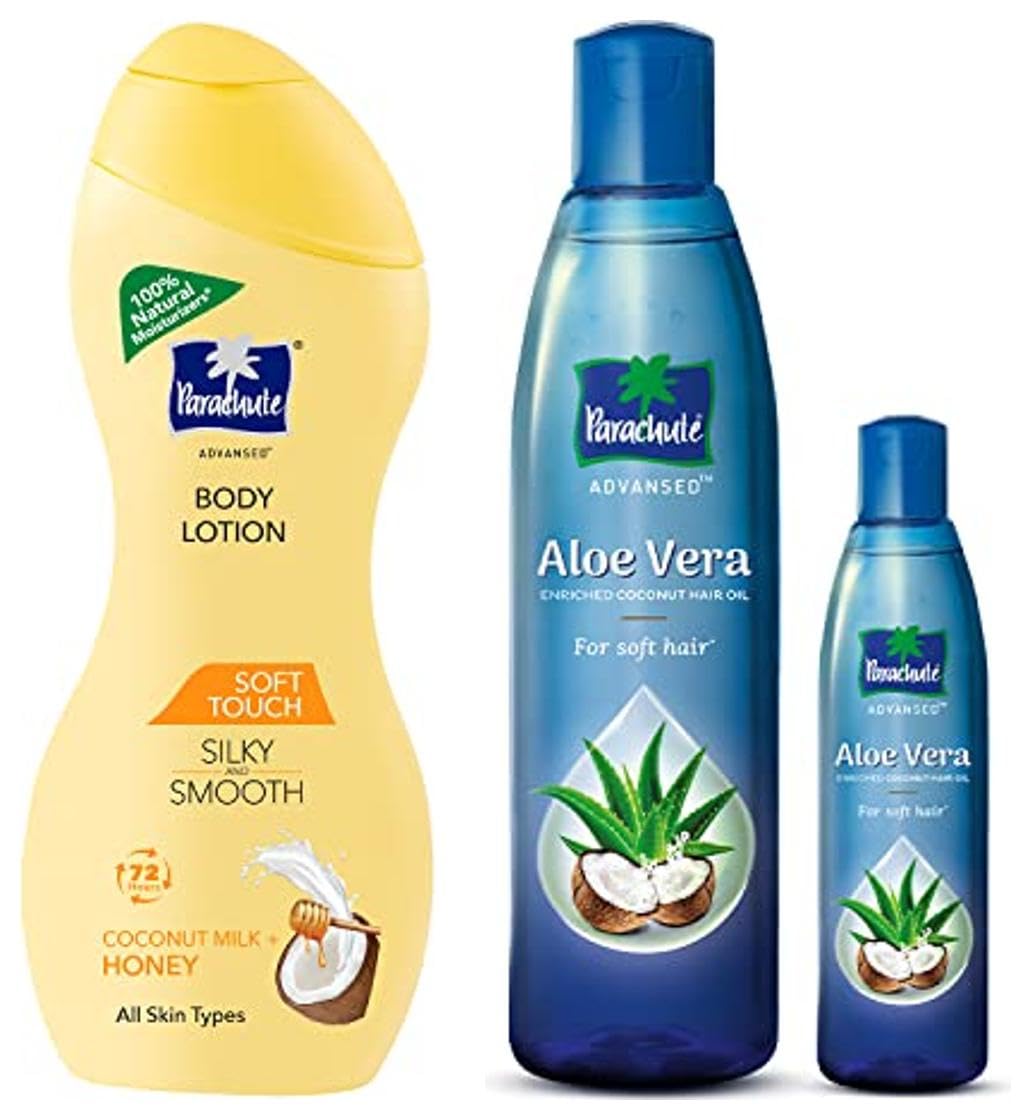 Parachute Advansed Soft Touch Body Lotion for Women & Men All Skin types 250ml | Pure Coconut Milk & Honey 100% Natural 72h MoisturisationGet naturally soft and smooth skin all year round with Parachute Advansed Soft Touch Body Lotion for women and men. This body lotion has been crafted for normal to dry skin to provide it with nourishment and hydration. Enriched with the goodness of proven natural moisturizers like Honey and coconut milk it penetrates deep into skin fighting signs of dryness and restoring moisture and leaving skin soft smooth and silky. This quick absorbing body lotion has a light non greasy texture that conditions and softens your skin without leaving behind any residue. Its mild fragrance will make you feel refreshed and rejuvenated. About our ingredients: Honey is a natural Humectant and emollient that hydrates and softens skin. It improves skin texture by making it smoother helps maintain elasticity of skin and gives it a natural glow. Coconut Milk is a miracle ingredient known for its nutritive and transformative effect on skin. It moisturizes and soothes skin from within restoring lost moisture and helps in repair of dry and irritated skin. The entire range of Parachute Advansed Body lotions is derived from nature and contains 100% natural moisturizers. It has been designed especially for Indian skin. Unlike many other body lotions we do not include any ingredients like mineral oil or any petroleum based ingredients (like petroleum Jelly or Liquid paraffin) in our formulation. Our body lotions are safe for Skin and free from silicones sulphates phthalates or any artificial colours. Ideal for normal/dry skin Suitable for use by both men and women.Parachute Advansed Aloe Vera Enriched Coconut Hair Oil 250ml + 75ml | For Soft Strong HairPresenting Parachute Advansed Aloe Vera Coconut enriched Hair Oil for the first time ever the miracle combination of pure Coconut oil and Aloe Vera extracts that makes your hair so soft that you canât stop touching it. Aloe Vera is known to deeply condition and moisturize hair from within while coconut oil penetrates 10X deeper and provides nourishment from root to tip making hair long and strong. This heavenly combination of goodness of Aloe Vera gel extracts and Pure Coconut oil provides a long-term solution to prevent frizzy dull and dry hair. Itâs a must-have in your weekly hair-care routine for hair for that is so soft. For best results apply Parachute Advanced Aloe Vera hair oil in the night and wash it off in the morning. It gives oil the time to go deep into the roots and nourish your hair from within. Itâs light and non-sticky and suitable for all hair types. You can also lightly apply pea-sized amount of this oil post hair-wash for conditioned and manageable hair look all day long thereby enabling you to style your hair any way you want to.