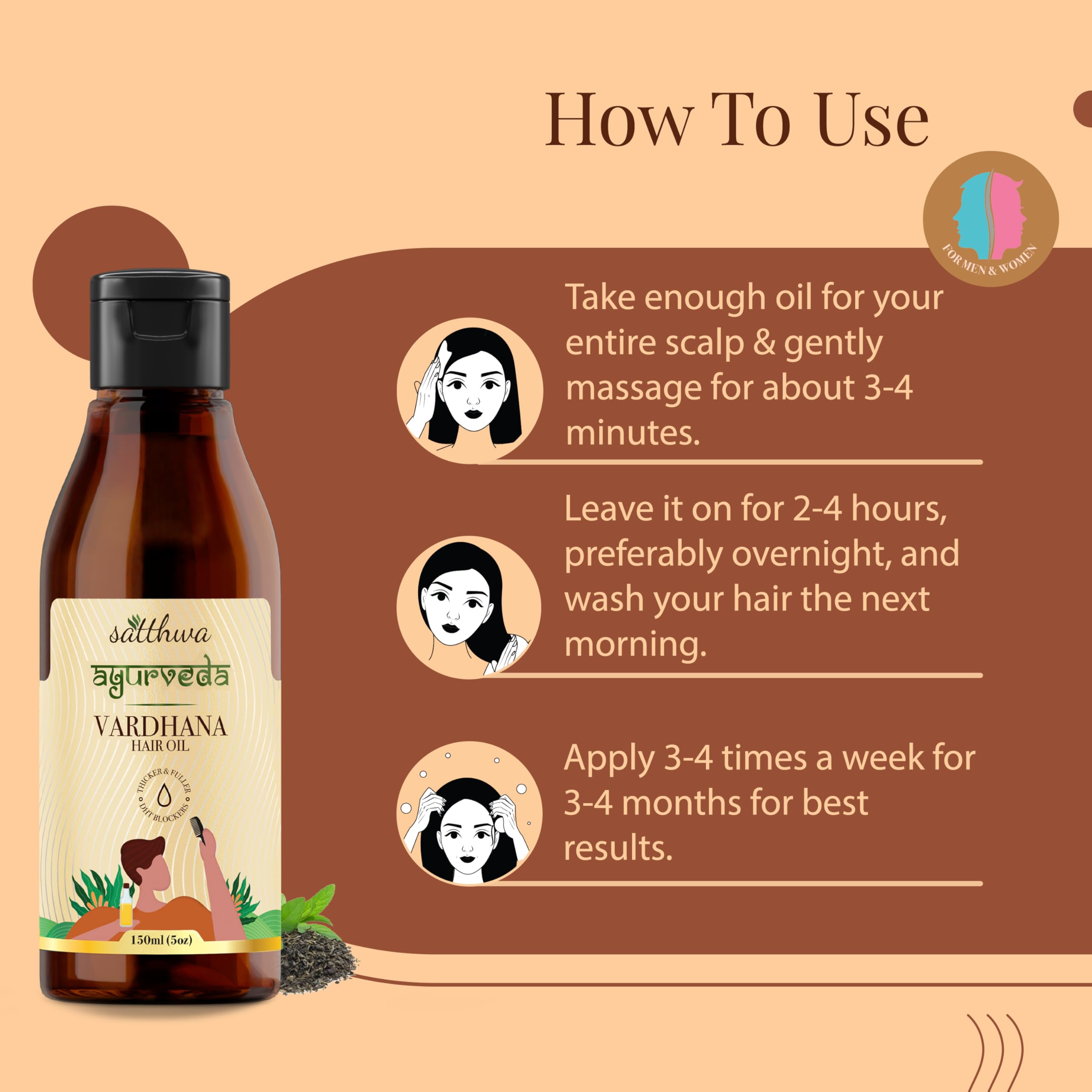 How to Use - application - Gently massage your hair and scalp with the Vardhana hair oil and leave it overnight or at least 2 hours before washing your hair for optimal results. Weekly usage of 2-3 times for 3-4 months is recommended.