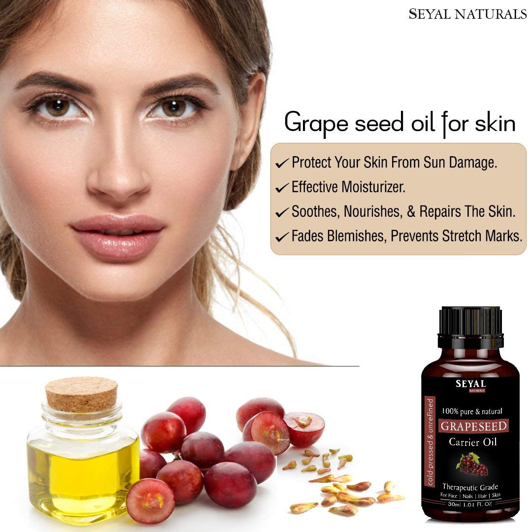 SKIN: Grapeseed Oil is versatile oil works as a perfect moisturizer and gives your skin a nourished look. Grapeseed Oil perfectly balances the oil content in your skin soothing away dryness and gives you glowing skin