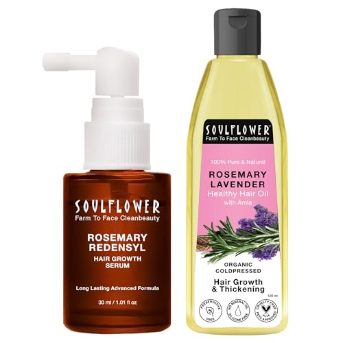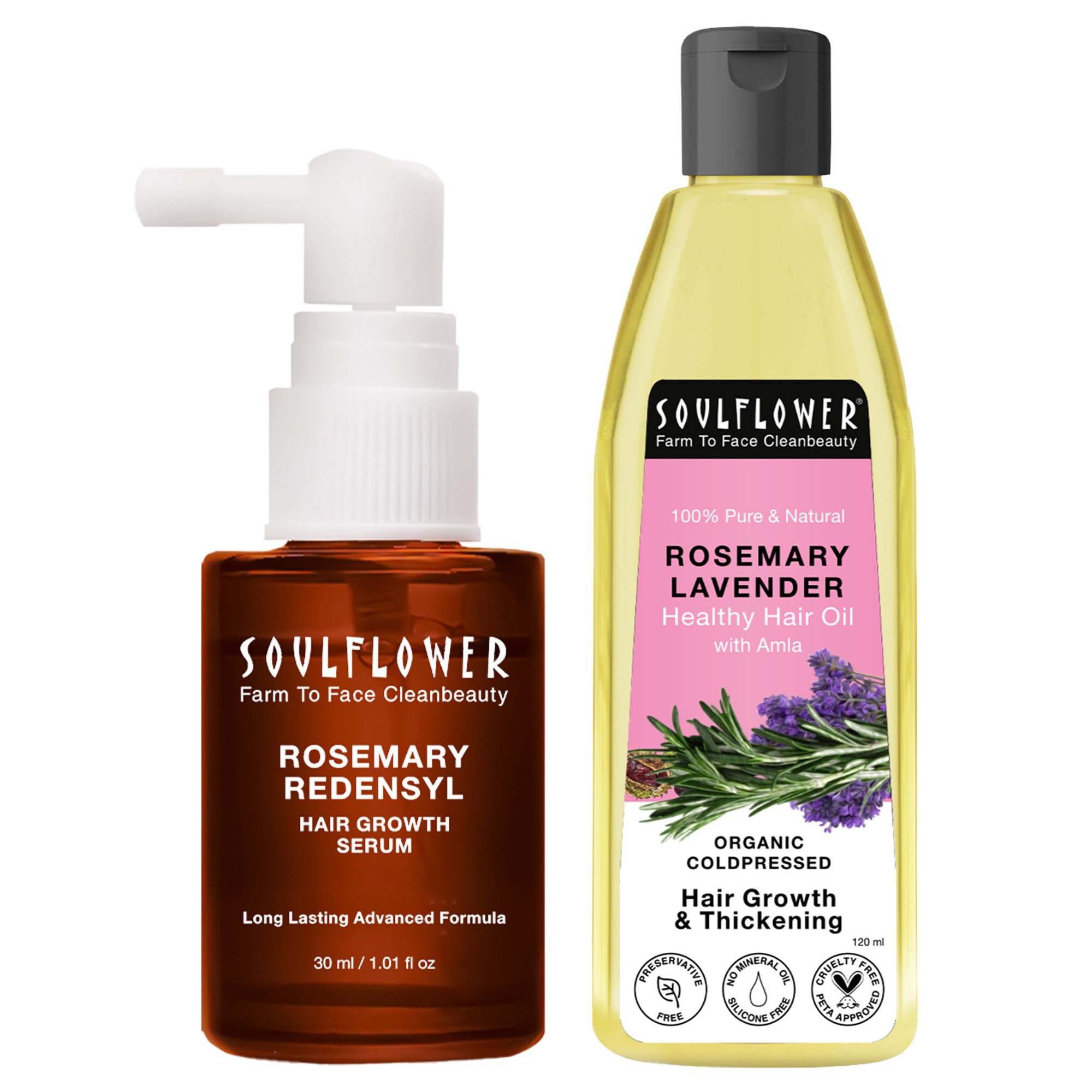Soulflower Rosemary Redensyl Hair Growth Serum 30ml with 4% Anagain, 1% Melanogray, Caffeine, Biotin, Keratin, Tea Tree, Chia Seeds & Rice Water & Rosemary Lavender Healthy Hair Oil 120ml | Pack of 2