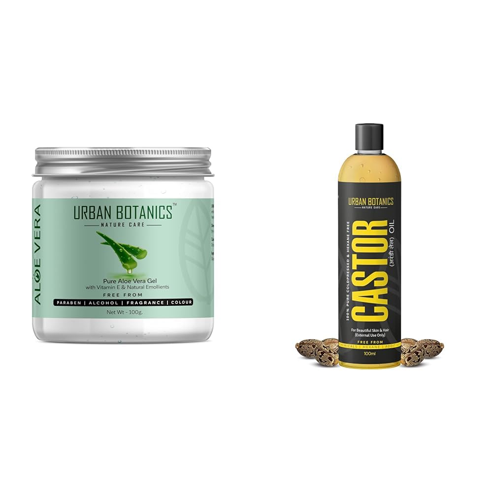 UrbanBotanics Pure Aloe Vera Skin/Hair Gel With Vitamin E & Natural Emollients (Paraben Free) 100gUrbanBotanics Pure Aloe Vera Skin/Hair Gel With Vitamin E & Natural Emollients (Paraben Free) 100gUrbanBotanics Cold Pressed Castor Oil for Hair Growth Skin Care Moisturising Dry Skin Nails Eyelash - Virgin Grade - 100mlUrbanBotanics Cold Pressed Castor Oil for Hair Growth Skin Care Moisturising Dry Skin Nails Eyelash - Virgin Grade - 100ml