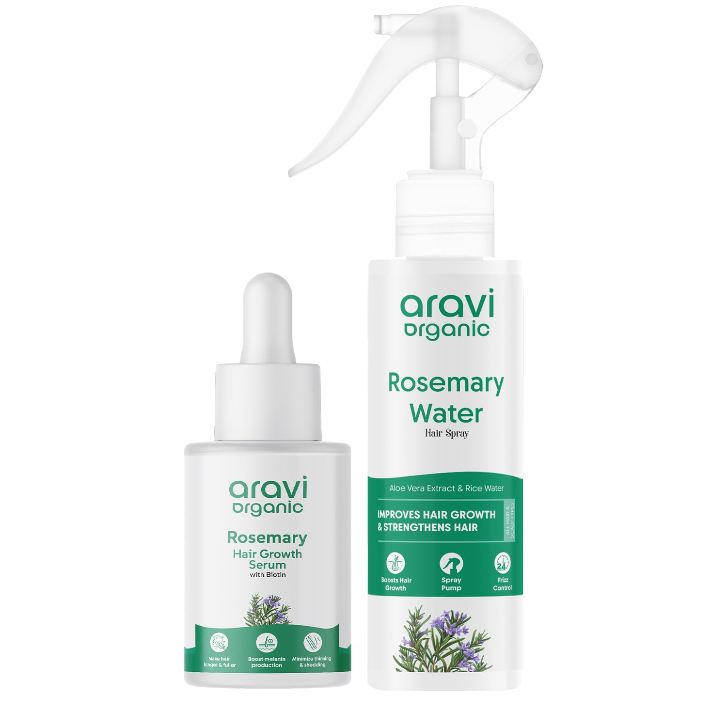 Elevate your hair care routine with the Aravi Organic Rosemary Hair Serum + Water Spray Comboâa dynamic duo designed to promote healthy hair growth enhance scalp health and add natural shine. Infused with pure rosemary extract this set combines the nourishing benefits of the serum with the refreshing mist of the water spray offering a comprehensive solution for all hair types.