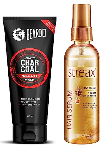 Beardo Activated Charcoal Peel Off Mask for Men 100g | Charcoal Face Mask for Glowing Skin | Detoxing Facial Kit for Men | Peel Off Mask MenEvery wondered what that black paste is that women apply on their faces and then instantly look. Deep cleanse your skin.Streax Hair Serum for Women & Men | Contains Walnut Oil | Instant Shine & Smoothness | Regular use Hair Serum for Dry & Wet Hair | Gives frizz-free Hair | Soft & Silky Touch | 100ml"Streax carries a sharp focus while developing products under its portfolio so as to provide world-class products with unique characteristics & high quality to all types of hair textures. Streax offers a wide range to its vibrant consumers with their women & men hair serum hair care hair styling and hair colours and more! Are you ready to unlock the secret to lustrous radiant hair? Look no further than Streax hair serum for frizzy hair your ultimate hair transformation solution. Crafted with care and expertise this exceptional serum for frizzy and dry hair is designed to nourish protect and revitalize your locks leaving you with a stunning mane that turns heads wherever you go. Streax excels in crafting hair care products that come with ISO Quality production process. Streax has been delivering high-quality all hair type products like curly straight & wavy hair products. Find more of our innovative product range that are a part of our hair care range. "