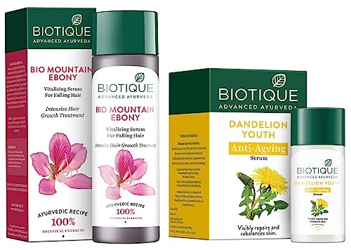Biotique Bio Mountain Ebony Vitalizing Serum For Falling Hair Intensive Hair Growth Treatment 120MLStimulates hair from root to tip and leaves scalp feeling toned exhilarated free from dryness and irritation. It does not make hair greasy.Biotique Bio Dandelion Visibly Ageless Serum 40 mlThis ligtening serum is a rare combination of pure dandelion rich in Vitamin E and minerals blended with nutmeg oil. Used regularly it helps brighten skin fade dark spots and ease away wrinkles for a flawless complexion.