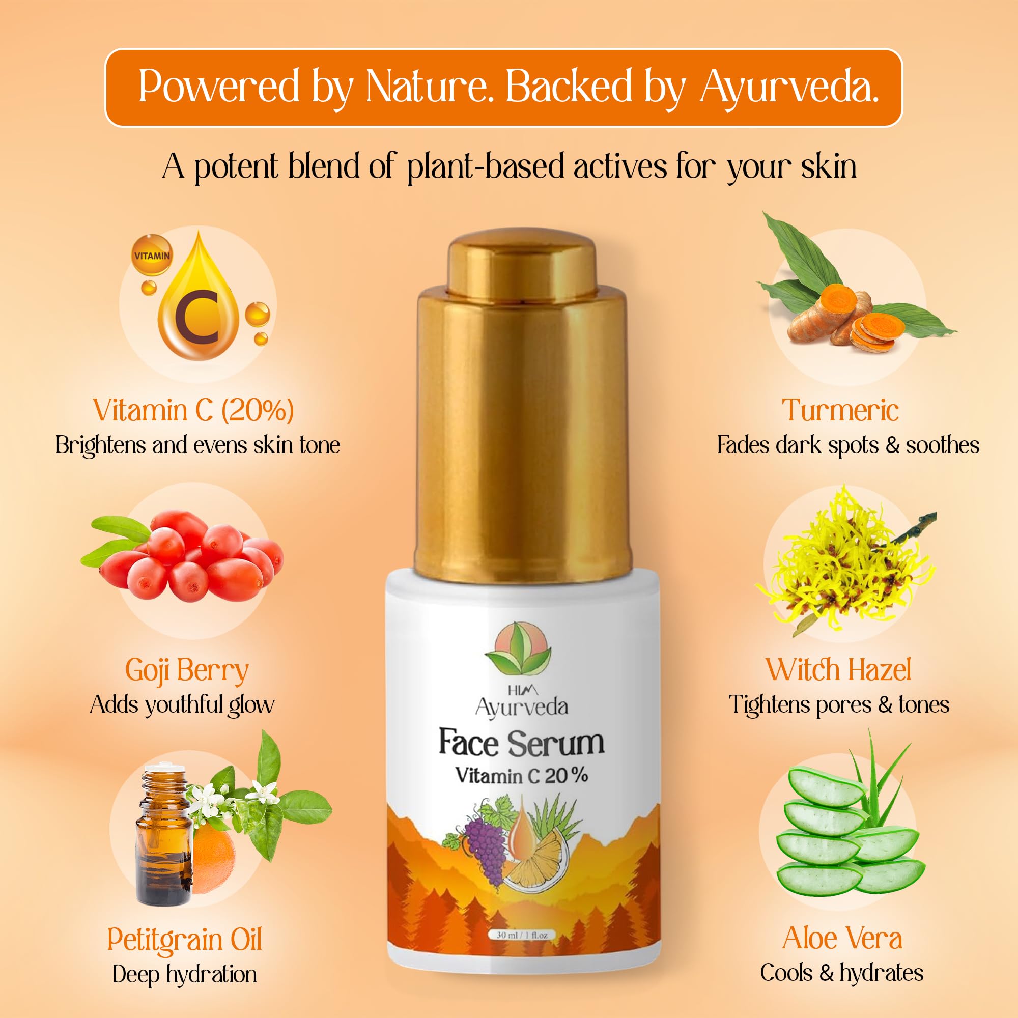 A healthy glowing skin has the most abundant protein in the body which is popularly known as collagen. It a speedy recovery against any skin damage. Nowadays with hectic lifestyle unbalanced diet pollution harmful UVA and UVB rays from the sunlight cause lower the production of collagen in the body. The ultimate solution to this is a good antioxidant serum. HIM AYURVEDA Vitamin C Serum has the ultimate amount of Vitamin C for the skin to maintain the skin elasticity and to fight against free radic. Free radicare the damaging molecules that is harmful for the inner and outer layer of skin. As per research to get a synergistic antioxidant effect in the perfect elixir Vitamin C should be combined with Hyaluronic Acid and Vitamin E. They together fight against all free radicand protect skin against the oxidation process. Other key ingredients such as Glycolic Acid exfoliates dead skin cells dissolves pigmentation marks Lactic Acid converts the dull skin into radiant skin and makes the skin supple Niacinamide s sensitivity s open pores Witch Hazel Extract tightens skin and Aloe Vera cleanses pores.