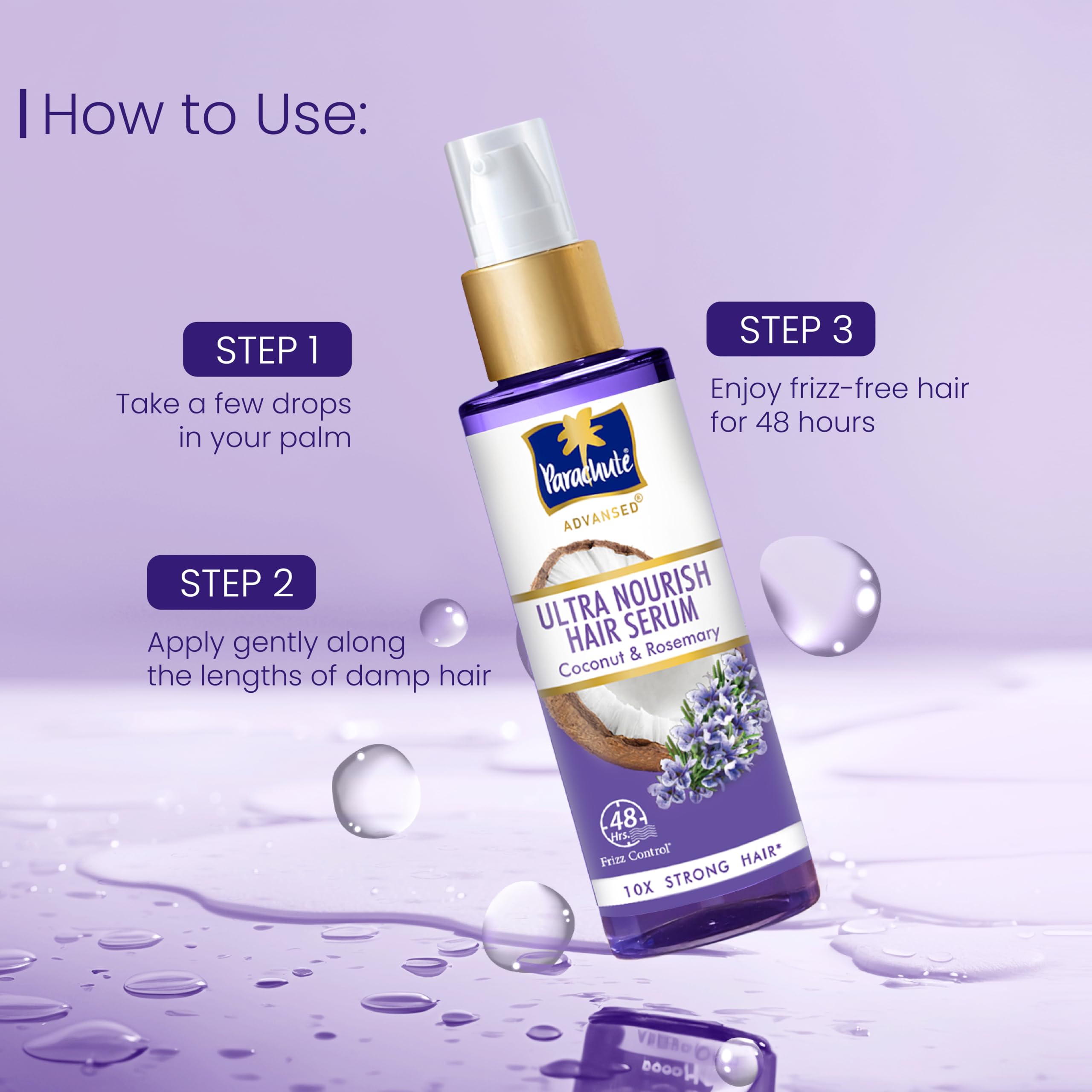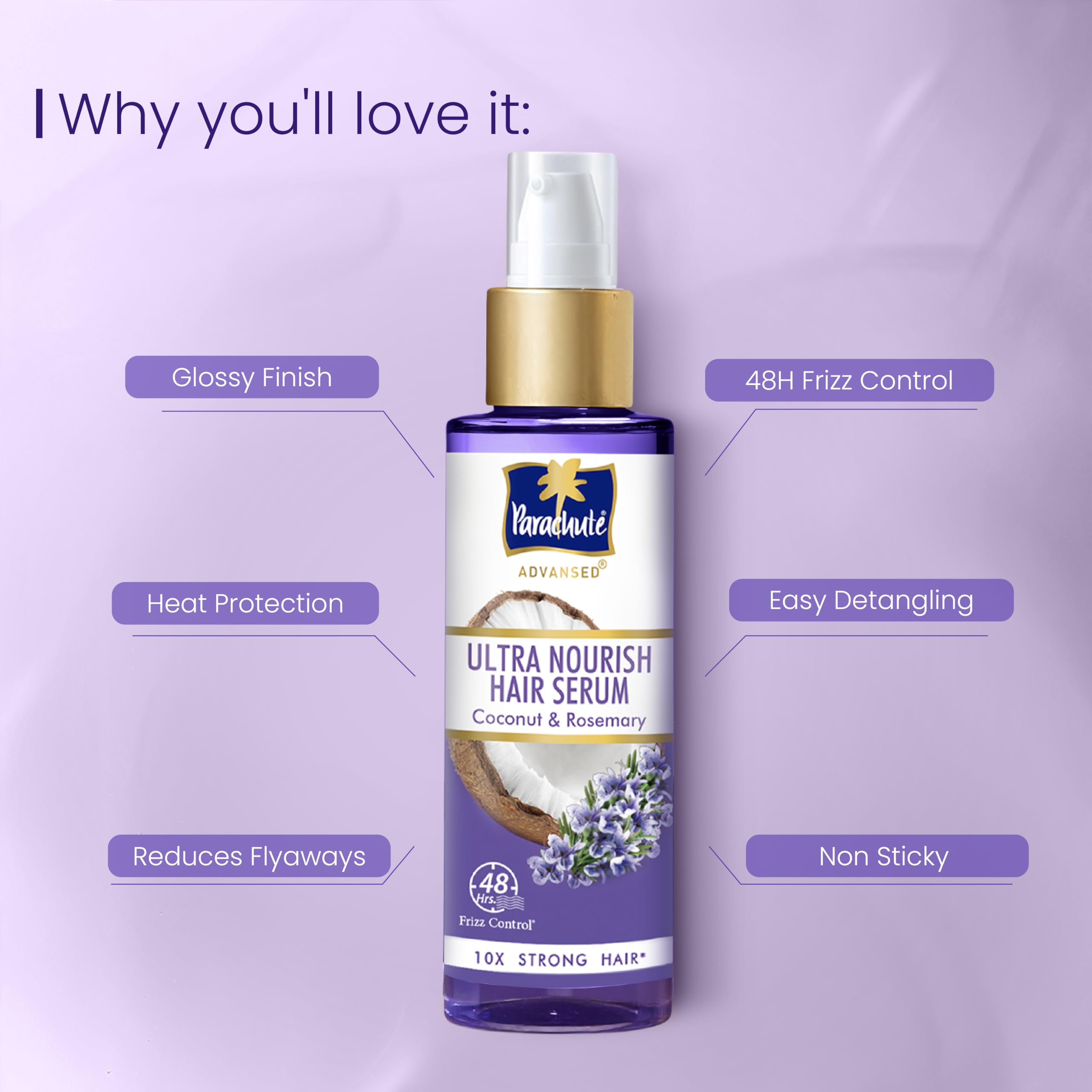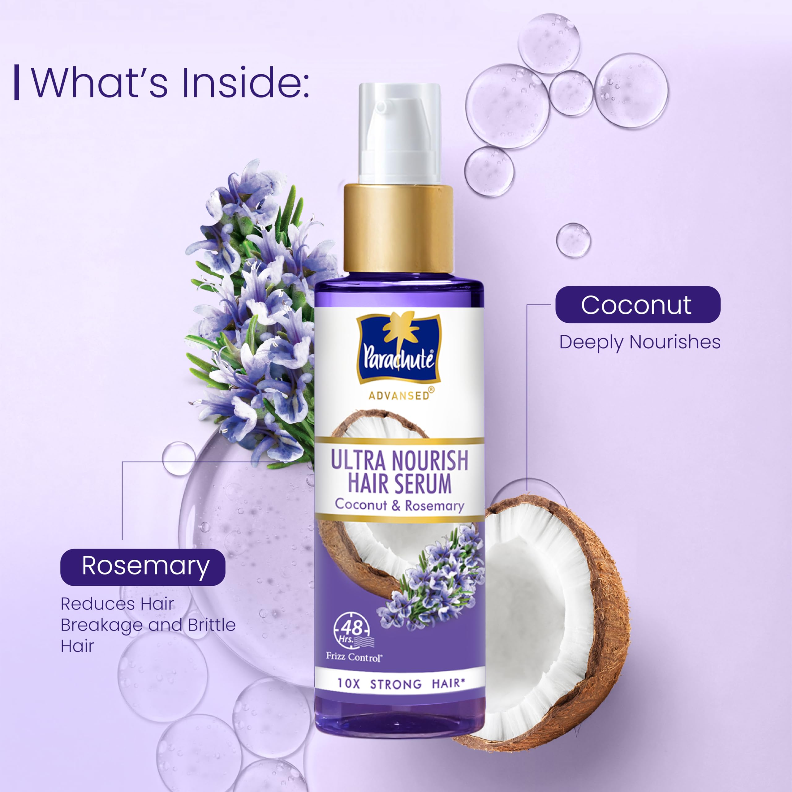 Packed with: Goodness of Coconut & Rosemary a powerhouse duo that nourishes strengthens and helps reduce breakage. This ultra nourish serum makes your hair healthy strong and beautiful. Keeps your hair: Extremely Nourished Healthy & Strong! Controls frizz for 48 hours.