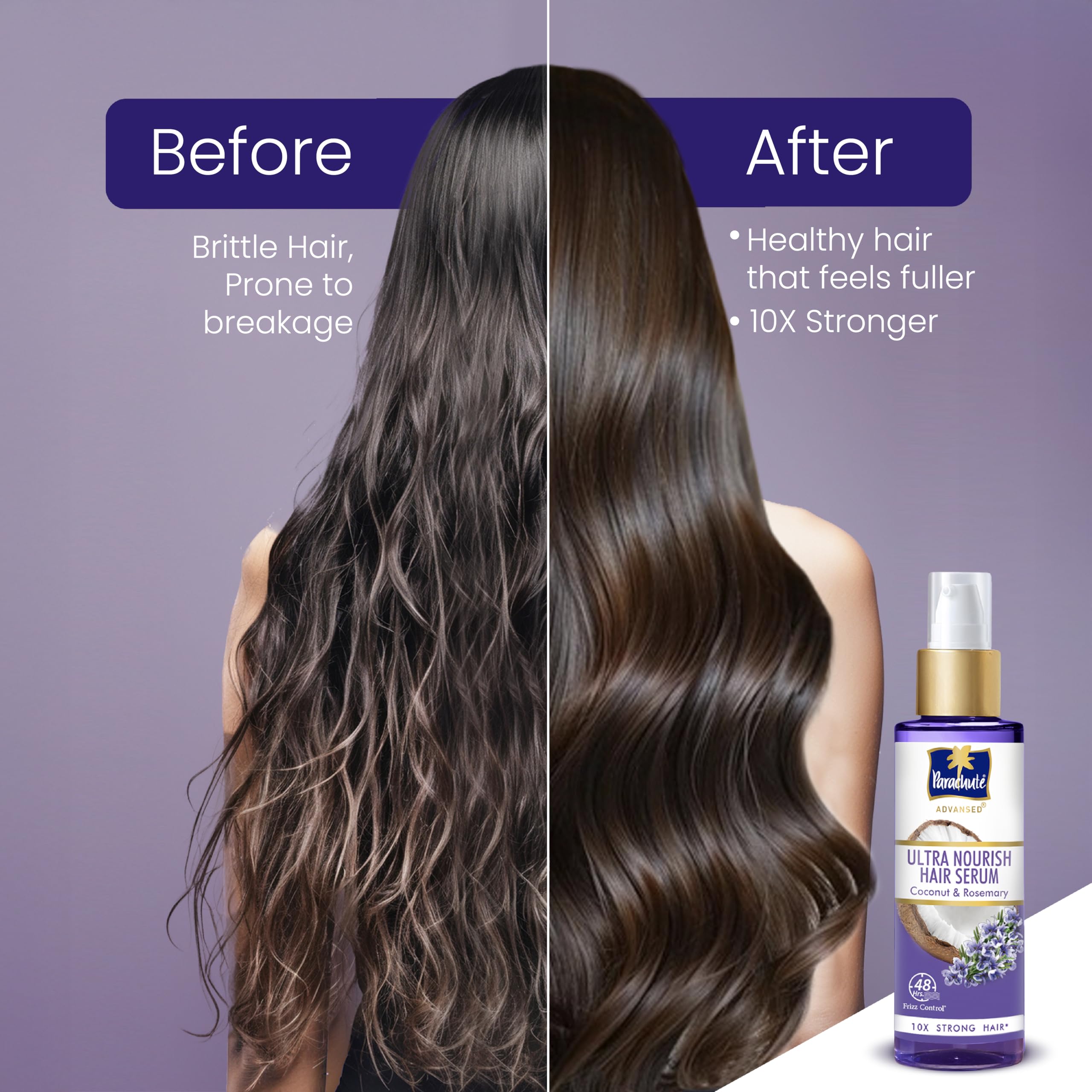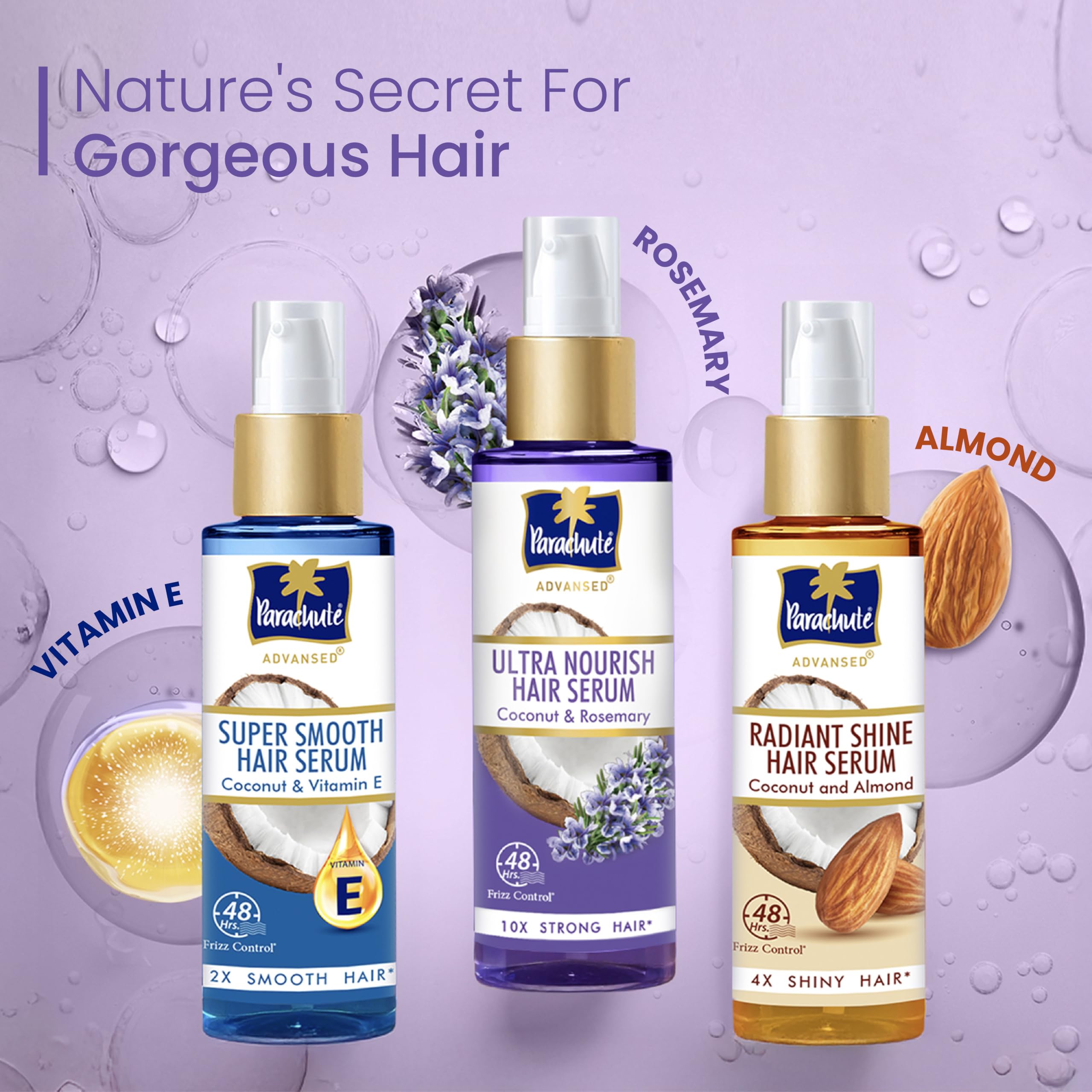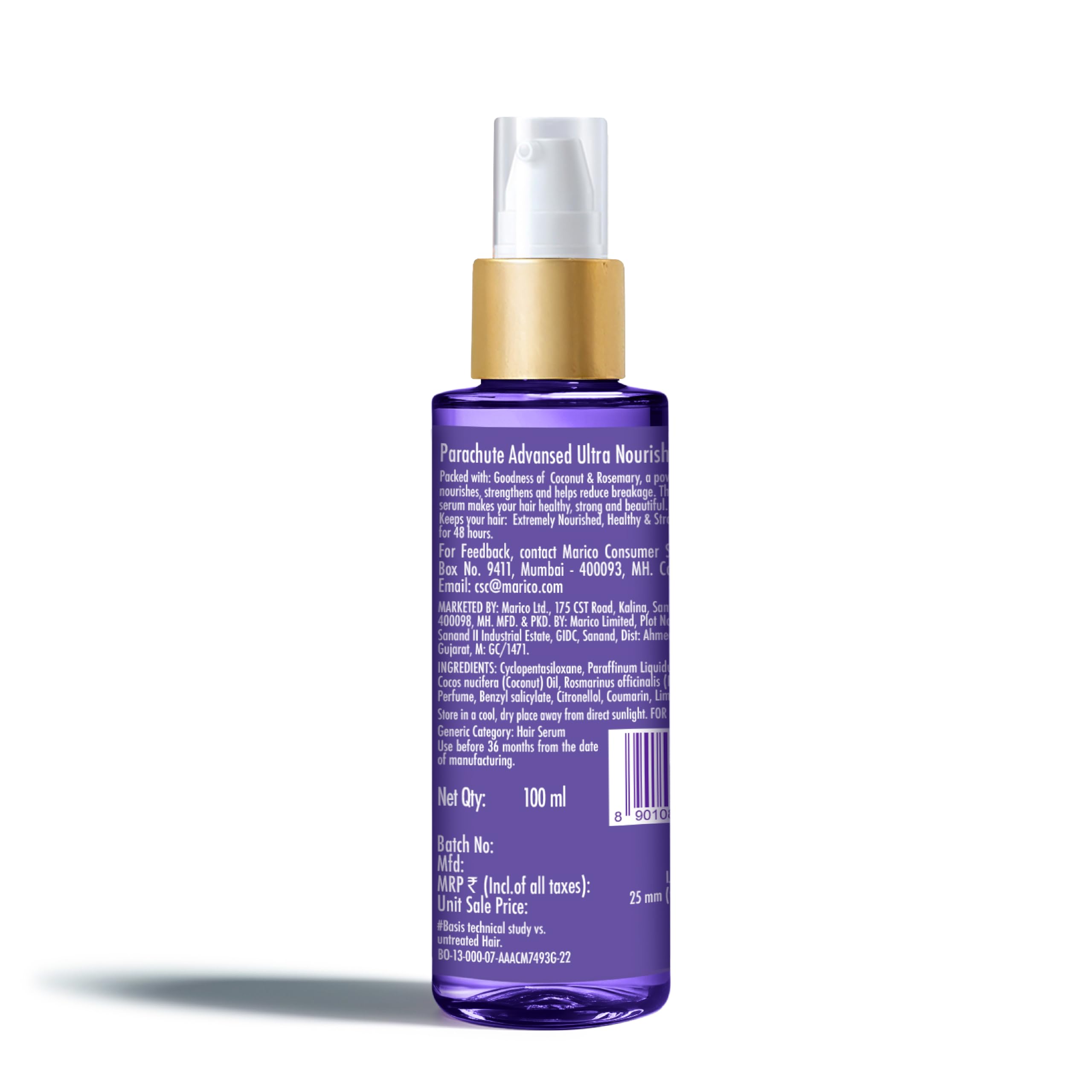 Packed with: Goodness of Coconut & Rosemary a powerhouse duo that nourishes strengthens and helps reduce breakage. This ultra nourish serum makes your hair healthy strong and beautiful. Keeps your hair: Extremely Nourished Healthy & Strong! Controls frizz for 48 hours.