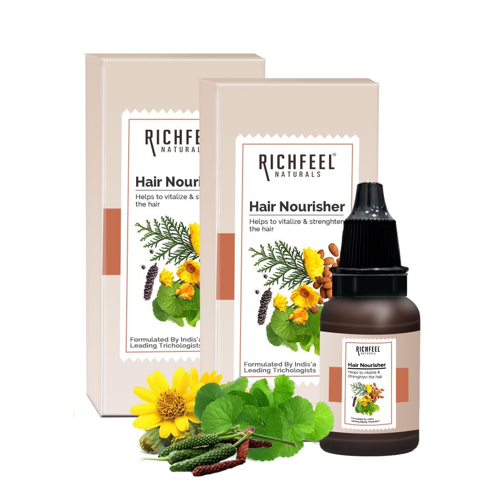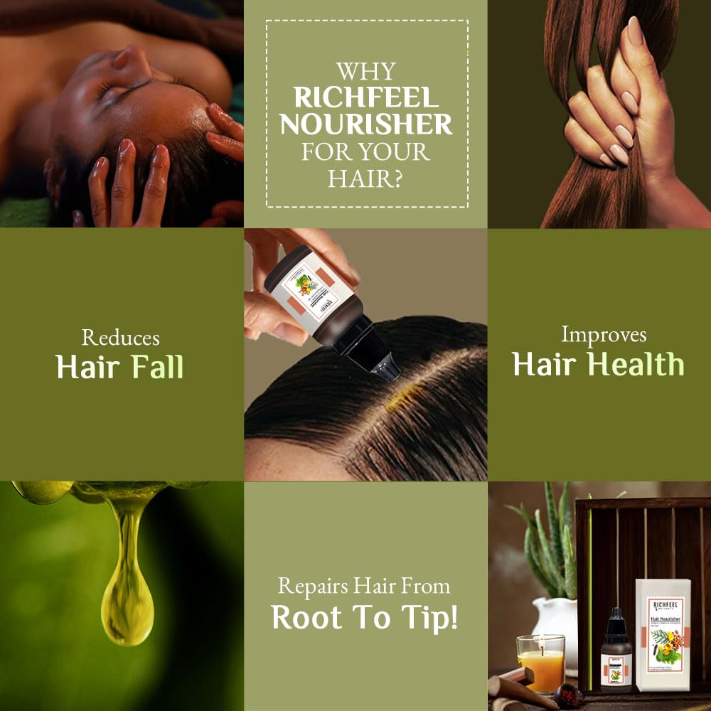 RIchfeel Hair Nourisher Richfeel's Hair Nourisheris a unique organic preparation that is the best all hair types. When used regularly the unique nourisher can do wonders to your hair. The essential nutrients stimulate hair growth and nourish hair from its roots to the tip. It effectively s hair fall and s dandruff. We always want healthy and beautiful hair. Healthy looking hair is a sign of good health. Your hair needs Naturals and healthy nutrients that would have a huge inence on your scalp and hair body.Richfeel Hair Nourisher does a truly systematic job for your hair. The formula is filled with nutrients and Naturals herbsthat give you the healthiest hair ever. The traditional herbs revitalize the scalp and improve the strength and volume of your hair. It also helps in managing issues like hair thinning dullness dryness and split ends. Does your hair need food? Just like your body needs food for a good health your hair also needs good food. Treating your hair with the right products will give you the mane you've always wanted. Use of a good nourishing promotes healthy hair growth and effectively contributes to your hair's overall health. Why use Richfeel Hair Nourisher? It s your hair health Provides hair growth and Naturals conditioning It helps transforms the overall look and feel of your hair It acts excellent on chemically treated hair by making it gy and vibrant.
